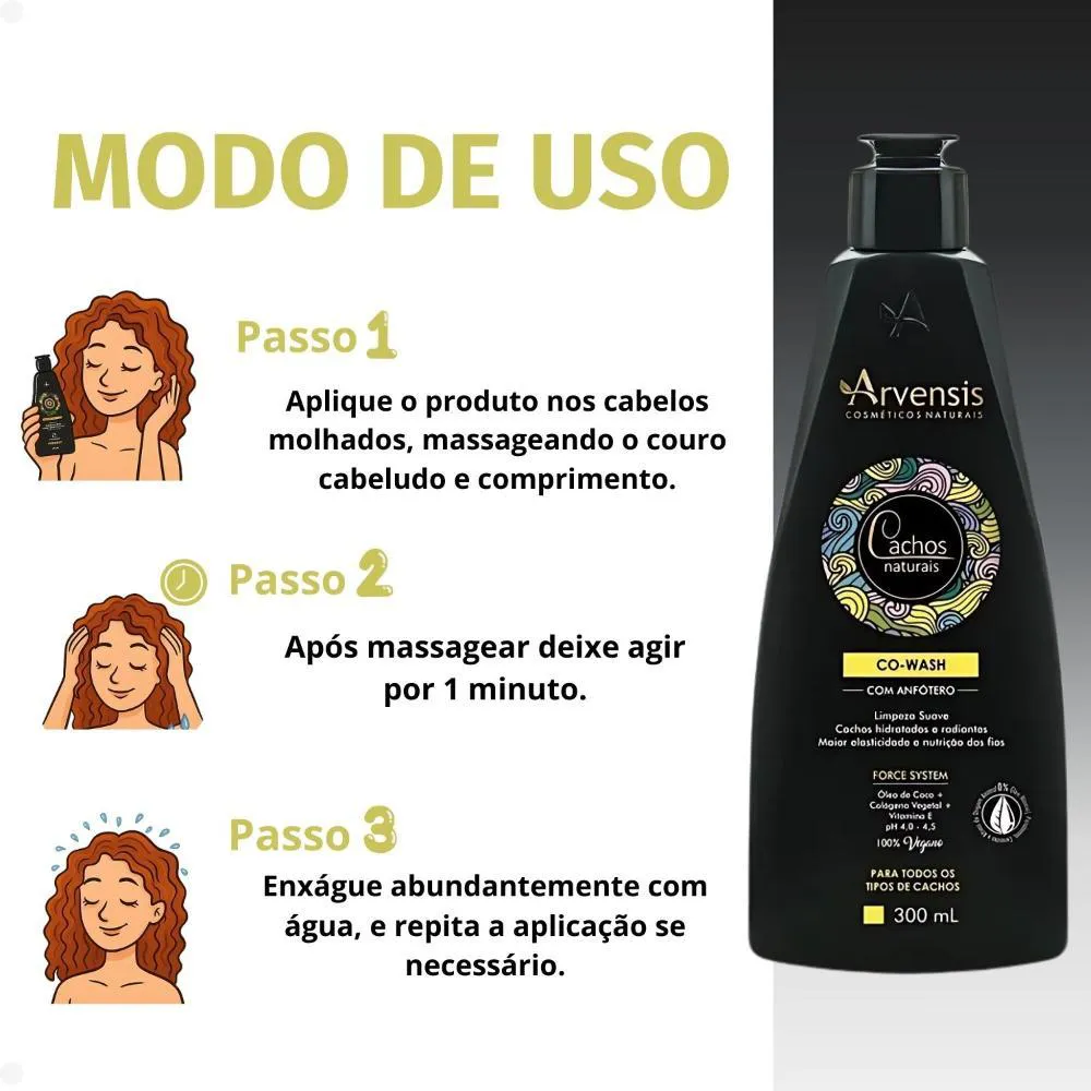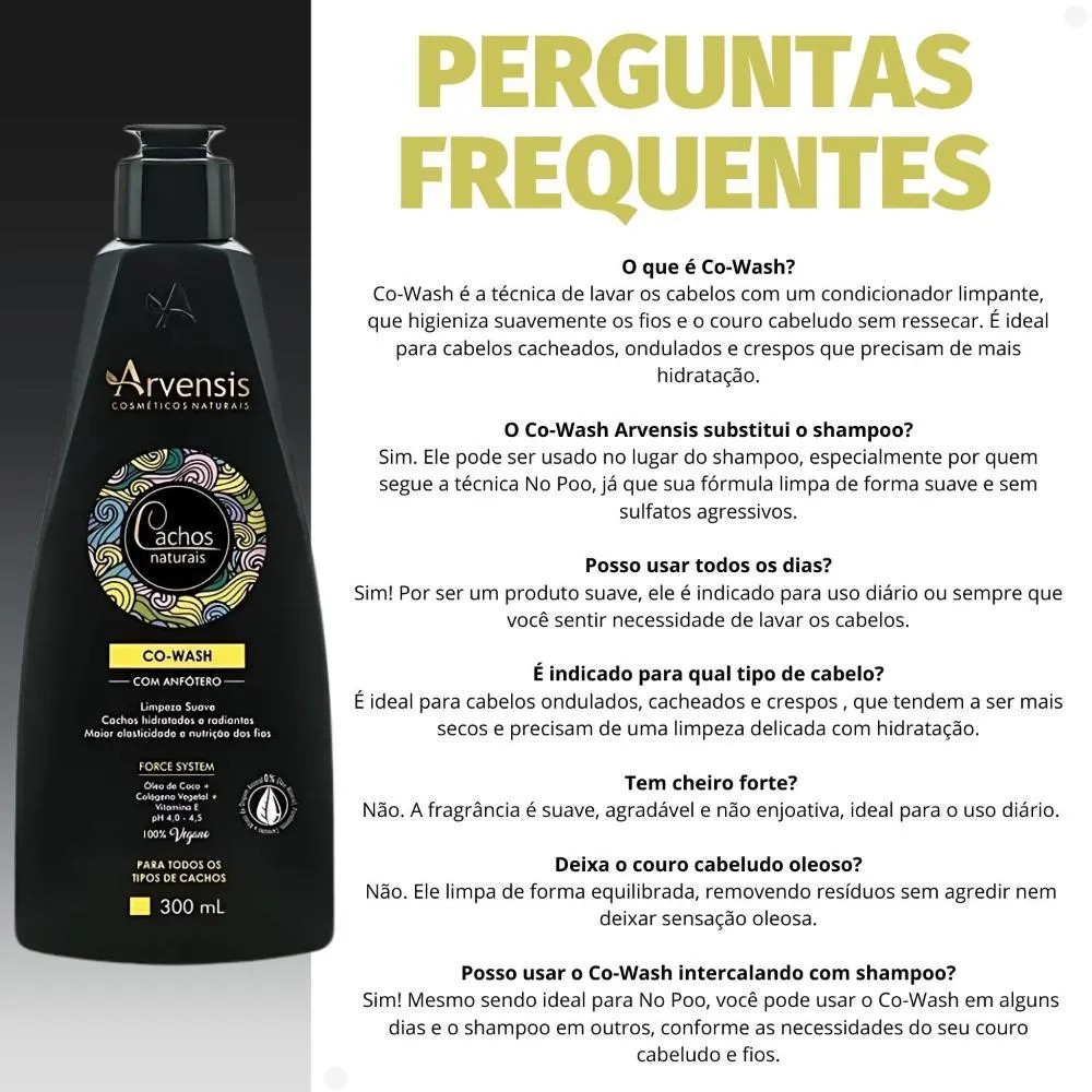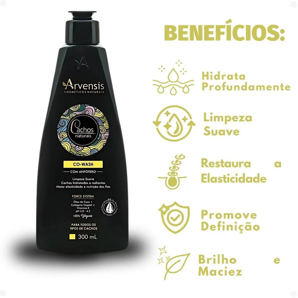 Co-Wash Arvensis Cachos Naturais 300ml O Co-Wash Arvensis Cachos Naturais é um condicionador limpante ideal para quem busca uma limpeza suave e hidratante, sem agredir os fios. Perfeito para técnicas de No Poo, ele substitui o shampoo tradicional, limpando delicadamente o couro cabeludo enquanto trata os cabelos cacheados, ondulados e crespos. Sua fórmula é enriquecida com Óleo de Coco, colágeno Vegetal e vitamina e, ativos que hidratam profundamente, restauram a elasticidade e promovem definição, brilho e maciez aos cachos. Livre de sulfatos, parabenos, petrolatos, silicones e ingredientes de origem animal, é um produto 100% vegano e cruelty-free. Ideal para uso diário, ele mantém os fios limpos, nutridos e com movimento natural. . Modo de usar: Aplique o Co-Wash Cachos Naturais nos cabelos molhados, massageie o couro cabeludo e comprimento dos fios suavemente e deixe por 1 minuto. Enxágue bem. Reaplique, se necessário. O uso completo da linha Cachos Naturais favorece os resultados. Precauções: Somente para uso externo. Manter fora do alcance de crianças. Caso ocorrer alguma irritação, suspender o uso. Manter em local fresco e longe da iluminação solar. . Perguntas Frequentes O que é Co-Wash? Co-Wash é a técnica de lavar os cabelos com um condicionador limpante, que higieniza suavemente os fios e o couro cabeludo sem ressecar. É ideal para cabelos cacheados, ondulados e crespos que precisam de mais hidratação. O Co-Wash Arvensis substitui o shampoo? Sim. Ele pode ser usado no lugar do shampoo, especialmente por quem segue a técnica No Poo, já que sua fórmula limpa de forma suave e sem sulfatos agressivos. Posso usar todos os dias? Sim! Por ser um produto suave, ele é indicado para uso diário ou sempre que você sentir necessidade de lavar os cabelos. Ele é liberado para Low Poo e No Poo? Sim. O Co-Wash Arvensis é 100% liberado, ou seja, não contém sulfatos, silicones, parabenos, petrolatos nem óleo mineral. É indicado para qual tipo de cabelo? É ideal para cabelos ondulados, cacheados e crespos (tipos 2A a 4C), que tendem a ser mais secos e precisam de uma limpeza delicada com hidratação. . Código de Registro Sanitário (ANVISA) 25351.415809/2016-93