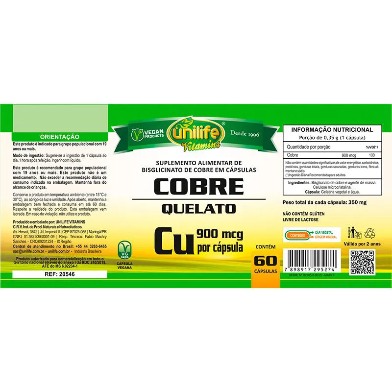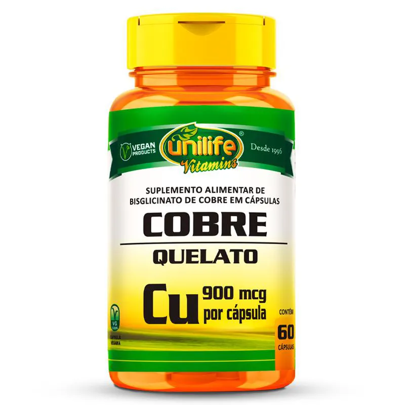 Suplemento alimentar de bisglicinato de cobre em cápsulas. Ele é um elemento químico de símbolo "Cu" (do latim cuprum). Este suplemento nutricional é muito importante devido a sua influência no bom funcionamento do organismo humano.