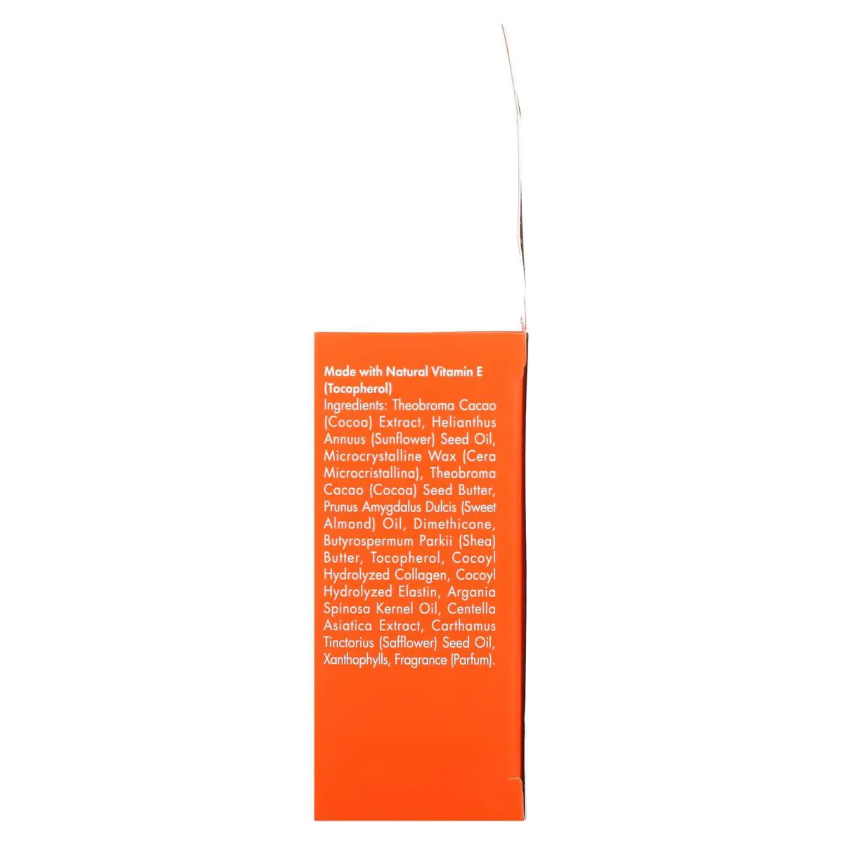 Extrato de Theobroma cacao (cacau), óleo de semente de Helianthusannuus (girassol), cera microcristalina (ceramicrocristallina), manteiga de semente de Theobromacacao (cacau), óleo de Prunus amygdalus dulcis (amêndoa doce), dimeticona, manteiga de Butyrospermum parkii (karité), tocoferol, colágeno hidrolisado de coco, elastina hidrolisada de coco, óleo de semente de Arganias pinosa, óleo de semente de Carthamustinctorius (cártamo), xantofilas, fragrância (parfum)