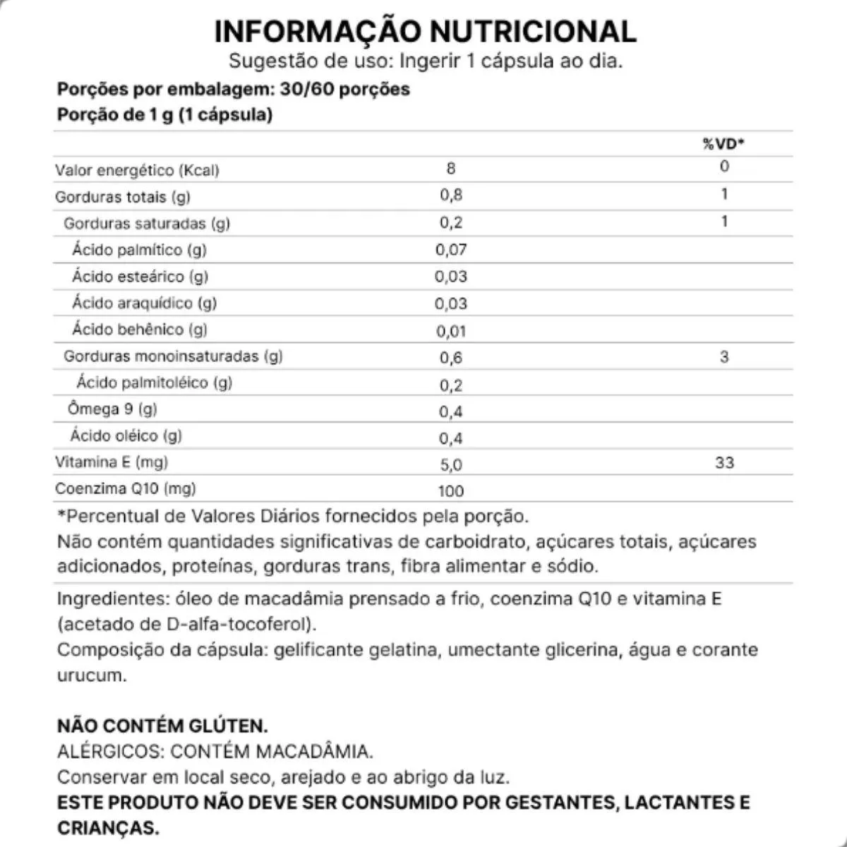- Suporte ao equilíbrio nutricional com Coenzima Q10 em dose padronizada de 1000mg.
