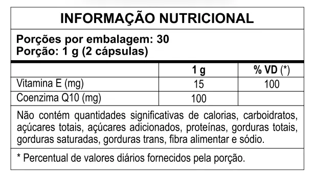 SUPLEMENTO ALIMENTAR DE COENZIMA Q10 E vitamina e EM CÁPSULAS INGREDIENTES: Coenzima Q10 e acetato de DL-alfa-tocoferol. Silicato de magnésio e estabilizante celulose microcristalino. Composição da cápsula: gelificante gelatina, umectante glicerol e corante dióxido de titânio. NÃO CONTÉM GLÚTEN. | ALÉRGICOS: PODE CONTER DERIVADOS DE soja, PEIXE, CRUSTACEOS (CARANGUEIJO), AMENDOIM, AMENDOA, AVELÃ, CASTANHA DE CAJU, CASTANHA DO BRASIL, MACADAMIAS, NOZES, PISTACHE E CASTANHAS. RECOMENDAÇÃO DE USO: Ingerir 2 (duas) cápsulas ao dia. Este produto é recomendado para Adultos acima de 18 anos. CONSERVAÇÃO E ADVERTÊNCIA: Não exceder a recomendação diária de consumo indicada na embalagem. Manter fora do alcance das crianças. Este produto não é um medicamento. Este produto é um suplemento alimentar. Conservar ao abrigo da luz, calor e umidade. Manter em local limpo e fresco. Não consumir se o lacre de proteção estiver violado. Após aberto, consumir o produto preferencialmente em até 90 dias. Este produto não deve ser consumido por gestantes, lactantes e crianças.