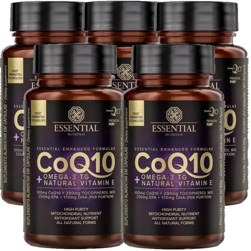 Coenzima Q10 Com Omega 3 + Vitamina E - Coq10 - (Combo 5 Un Com 60 Capsulas Cada) - Essential Nutrition