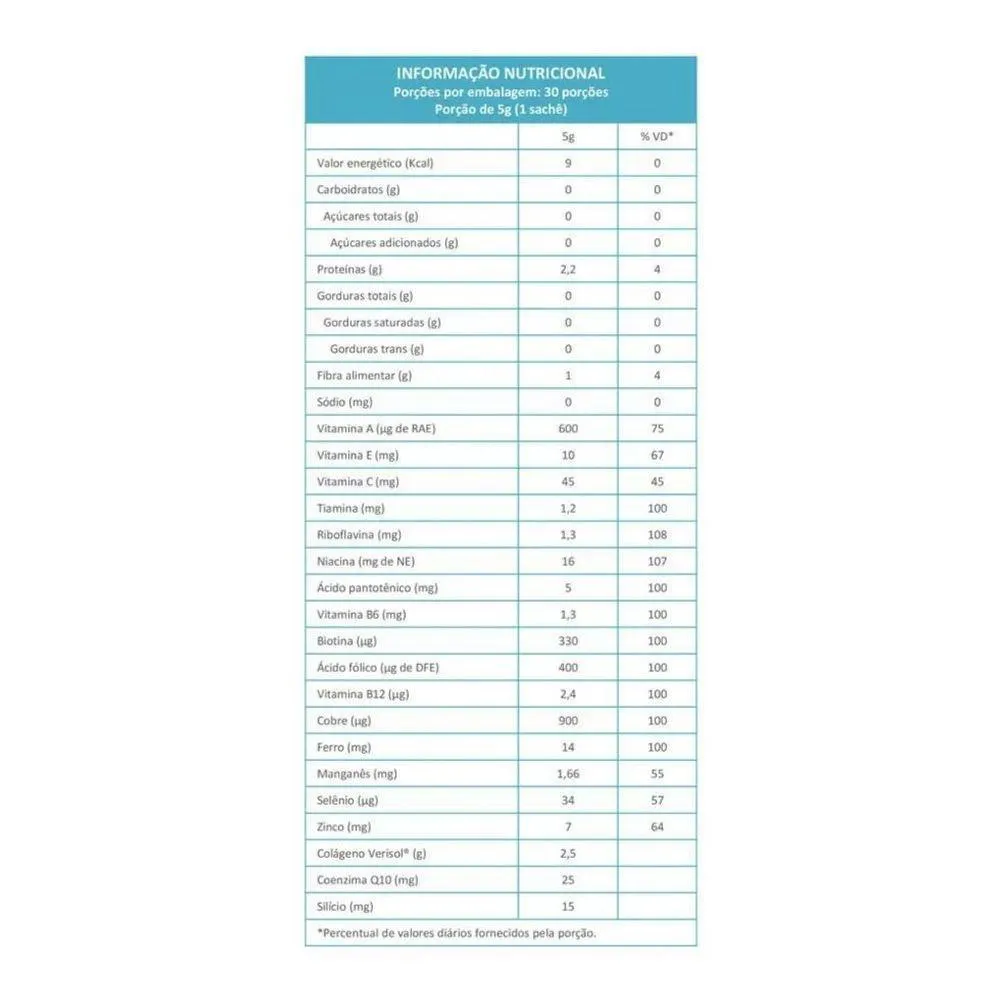 Informação Nutricional Colágeno Hidrolisado 2 em 1 VERISOL (30 Sachês de 5g) -MaxiNutriPorção de 5g (1 sachê)Quantidade por porção%VD(*)Valor energético9Kcal0%Carboidratos0g0%Açúcares totais0g0Açúcares adicionados0g-Proteínas2,2g4%Gorduras Totais0g0%Gorduras Saturadas0g0%Fibra Alimentar1g27%Sódio0mg0%Ácido Fólico400mcg100%Biotina30mcg100%Ferro14mg100%Vitamina A600mcg100%Vitamina B11,2mg100%Vitamina B21,3mg100%Vitamina B316mg100%Vitamina B55mg100%Vitamina B61,3mg100%Vitamina B122,4mcg100%Vitamina C45mg100%Vitamina E10mg100%Selênio34mcg100%Zinco7mg100%Vitamina D35mcg100%Cobre900mcg100%Manganês1,66mg100%Coenzyma Q1025mg-Silício15mg-* % Valores Diários com base em uma dieta de 2.000Kcal ou 8400kJ. Seus valores diários podem ser maiores ou menores dependendo das suas necessidades energéticas. Obs: Pode haver pequenas variações na informação nutricional, de acordo com o sabor.