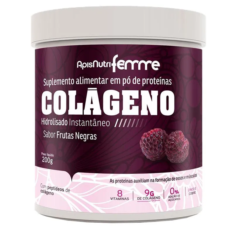 colágeno Hidrolisado Beauty Complex Apisnutri 200g Frutas Roxas É elaborado com Colágeno Hidrolisado, vitaminas (A, C , E , Complexo B, Zinco e Cobre). Por ser hidrolisado é solúvel em água e, portanto facilmente absorvido pelo organismo, ele apresenta elevado conteúdo protéico (84 a 90%). O Colágeno desempenha diversas funções nos organismos vivos, como manter as células dos tecidos unidas e fortalecê-las, participa no processo de cicatrização e/ou regeneração, dentre outras atividades. COMO TOMAR: