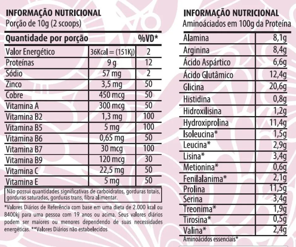 Colágeno hidrolisado, flocos de coco, aroma de coco, bisglicinato de magnésio, óleo de coco, fosfato tricálcico, monometionina de zinco, stévia, vitamina c, vitamina e, betacaroteno, bisglicinato de cobre, selênio metionina, vitamina B6, bisglicinato de silício, vitamina a, vitamina B9, vitamina B7, vitamina d. *PODE CONTER TRAÇOS DE GLÚTEN