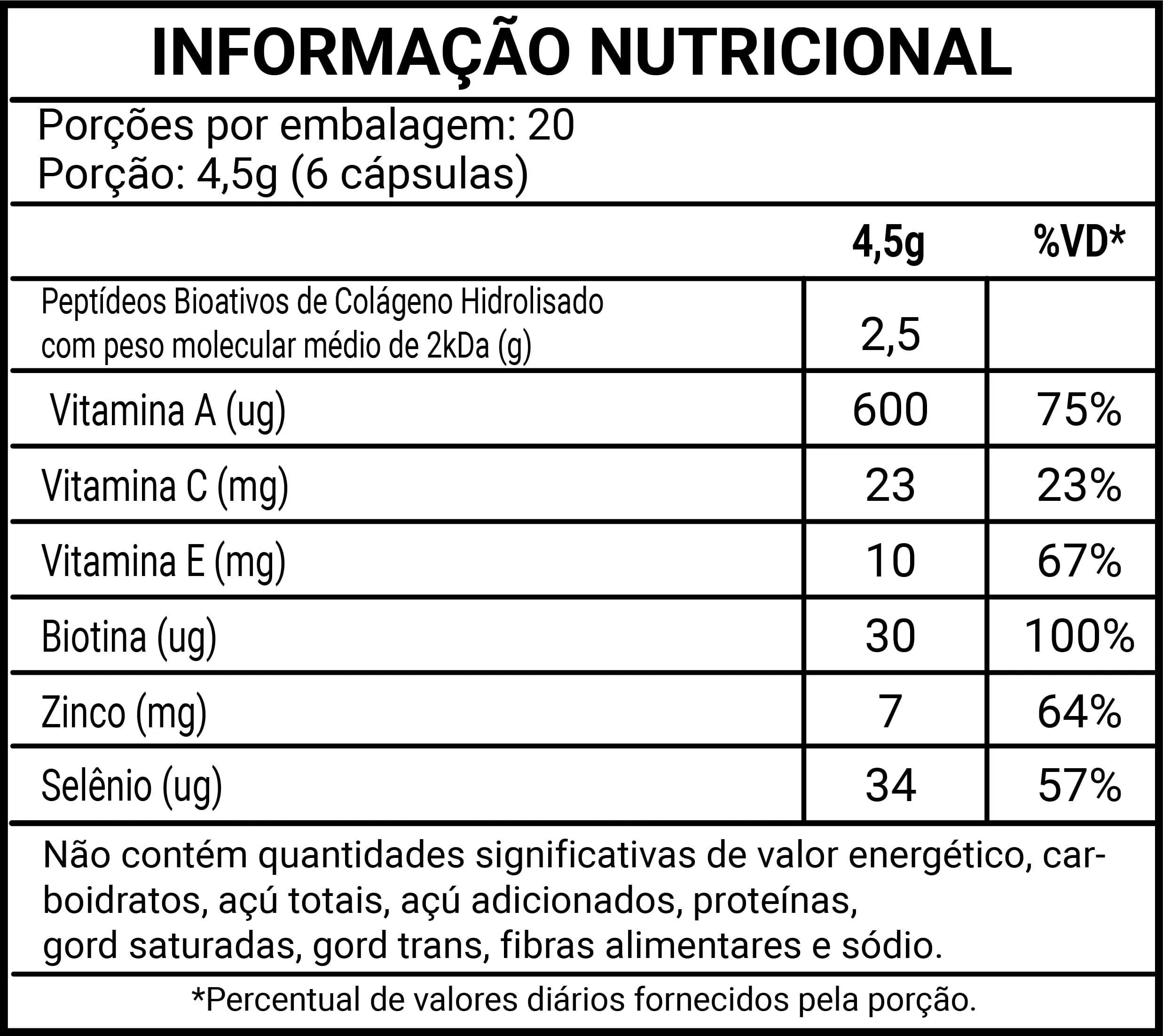 Peptídeos bioativos de colágeno hidrolisado (Verisol), vitamina c, vitamina e, zinco, vitamina a, selênio, vitamina B7, silicato de magnésio, dióxido de silício. Composição da cápsula: gelatina, azorrubina, dióxido de titânio e azul brilhante.