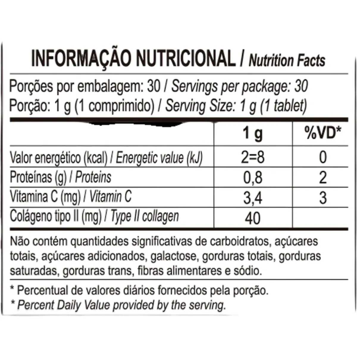 Não contém glúten Os ingredientes incluem colágeno hidrolisado, colágeno tipo II não hidrolisado, estearato de magnésio (utilizado como lubrificante) e outros excipientes essenciais à formulação do produto. É desenvolvido com alto padrão de qualidade para atender às necessidades dos consumidores.