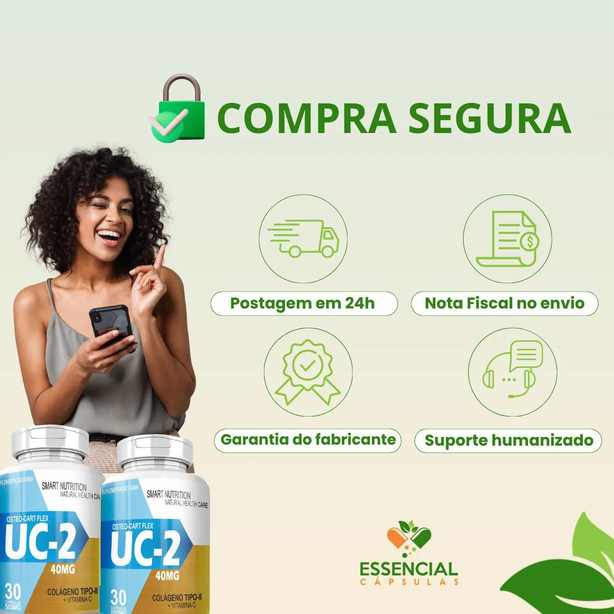 BEM VINDO(A) À ESSENCIAL CÁPSULAS Aqui, acreditamos que cuidar da saúde pode (e deve) ser algo natural, leve e diário. PRODUTO: - colágeno Tipo II 40 MG 30 Cápsulas MARCA: - 4Elementos BENEFÍCIOS: ● Contém colágeno naturalmente presente nas articulações ● Frequentemente associado a rotinas voltadas à mobilidade e conforto articular SUGESTÃO DE CONSUMO (PELO FABRICANTE): - 01 cápsula ao dia - Ingerir com 200ml de água IMPORTANTE SABER: - Este produto é um suplemento alimentar natural. - Não é medicamento e não substitui uma alimentação equilibrada nem o acompanhamento de um profissional da saúde. - Como um produto natural, seus benefícios podem ser vistos a partir de alguns dias do uso. - Os suplementos são destinados a pessoas saudáveis. Sua finalidade é fornecer nutrientes, substâncias bioativas, enzimas ou probióticos em complemento à alimentação. COMPOSIÇÃO: - Colágeno não hidrolisado (tipo II) 40MG , vitamina c revestida (ácido ascórbico) 45MG e excipiente q.s.p 500mg. NÃO CONTÉM GLÚTEN CONTRAINDICAÇÃO: - O uso não é recomendado para gestantes, lactantes e crianças. - Em caso de uso contínuo de medicamentos ou condições específicas de saúde, busque a orientação de um profissional da saúde. QUALIDADE: - Sabemos que o mercado de suplementos é competitivo, com opções para todos os públicos e faixas de preço. Na nossa loja, priorizamos a qualidade em cada detalhe. Por isso, escolhemos trabalhar apenas com fábricas que utilizam matérias-primas de excelência e seguem rigorosos padrões de produção. ENVIAMOS RAPIDINHO: - Seu pedido é preparado com todo cuidado e postado em até 24 horas úteis após a confirmação da compra. (Na maioria das vezes, enviamos bem antes disso)! FALE CONOSCO: Tem dúvidas ou quer conversar sobre o produto? Nosso atendimento é humanizado e está sempre pronto para te ouvir com muita atenção!