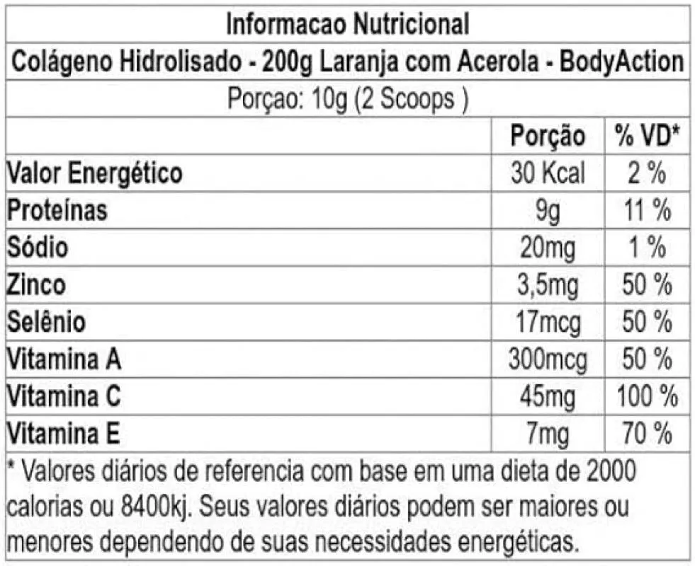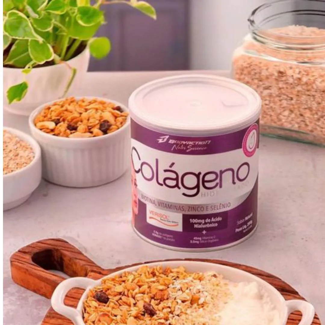 colágeno Verisol com Ácido Hialurônico 200g BodyactionSobre o produto:O Colágeno Verisol com Ácido Hialurônico 200g Bodyaction é um suplemento premium formulado com peptídeos bioativos de colágeno Verisol, que auxiliam na manutenção da pele, cabelos, unhas e articulações. Sua composição é enriquecida com ácido hialurônico, coenzima Q10, silício, biotina, vitaminas e minerais essenciais, proporcionando um suporte completo para a saúde e beleza.O colágeno Verisol é um tipo específico de colágeno hidrolisado, desenvolvido para estimular a produção natural dessa proteína no organismo, promovendo maior elasticidade e firmeza da pele, além de contribuir para a integridade das articulações.Como usar:Diluir 2 scoops (10g) em 200ml de água, suco ou outra bebida de sua preferência. Consumir uma vez ao dia, ou conforme recomendação de um profissional de saúde.Benefícios:- Saúde da pele: Ajuda a manter a firmeza e elasticidade, reduzindo rugas e linhas de expressão.- Fortalecimento dos cabelos e unhas: Atua no crescimento e resistência capilar e das unhas.- Hidratação e regeneração da pele: O ácido hialurônico auxilia na retenção de umidade, deixando a pele mais hidratada.- Suporte para articulações e ossos: O colágeno é essencial para a manutenção da cartilagem e das estruturas ósseas.- Fórmula enriquecida com vitaminas e minerais: Contém vitaminas A, C, E, biotina, selênio e zinco, que potencializam os benefícios do colágeno.- Coenzima Q10 e silício: Antioxidantes que ajudam a combater os radicais livres e melhoram a saúde da pele.- Baixo teor calórico: Apenas 34 kcal por porção.Alergênicos:Pode conter traços de leite, soja e derivados.Ingredientes:Peptídeos bioativos de colágeno Verisol, ácido hialurônico, coenzima Q10, silício, vitamina a, vitamina c, vitamina e, biotina, selênio, zinco, aromatizantes, espessantes e edulcorantes.Advertências:- Este produto não substitui uma alimentação equilibrada e deve ser consumido conforme orientação de um profissional de saúde.- Não deve ser consumido por gestantes, lactantes e crianças sem orientação médica.- Conservar em local seco e fresco, ao abrigo da luz e umidade.Conclusão:O Colágeno Verisol com Ácido Hialurônico 200g Bodyaction é um suplemento completo para quem deseja cuidar da pele, cabelos, unhas e articulações de forma eficaz. Sua fórmula avançada combina colágeno de alta absorção com nutrientes essenciais para promover mais firmeza, hidratação e fortalecimento, sendo um excelente aliado para a saúde e beleza no dia a dia.