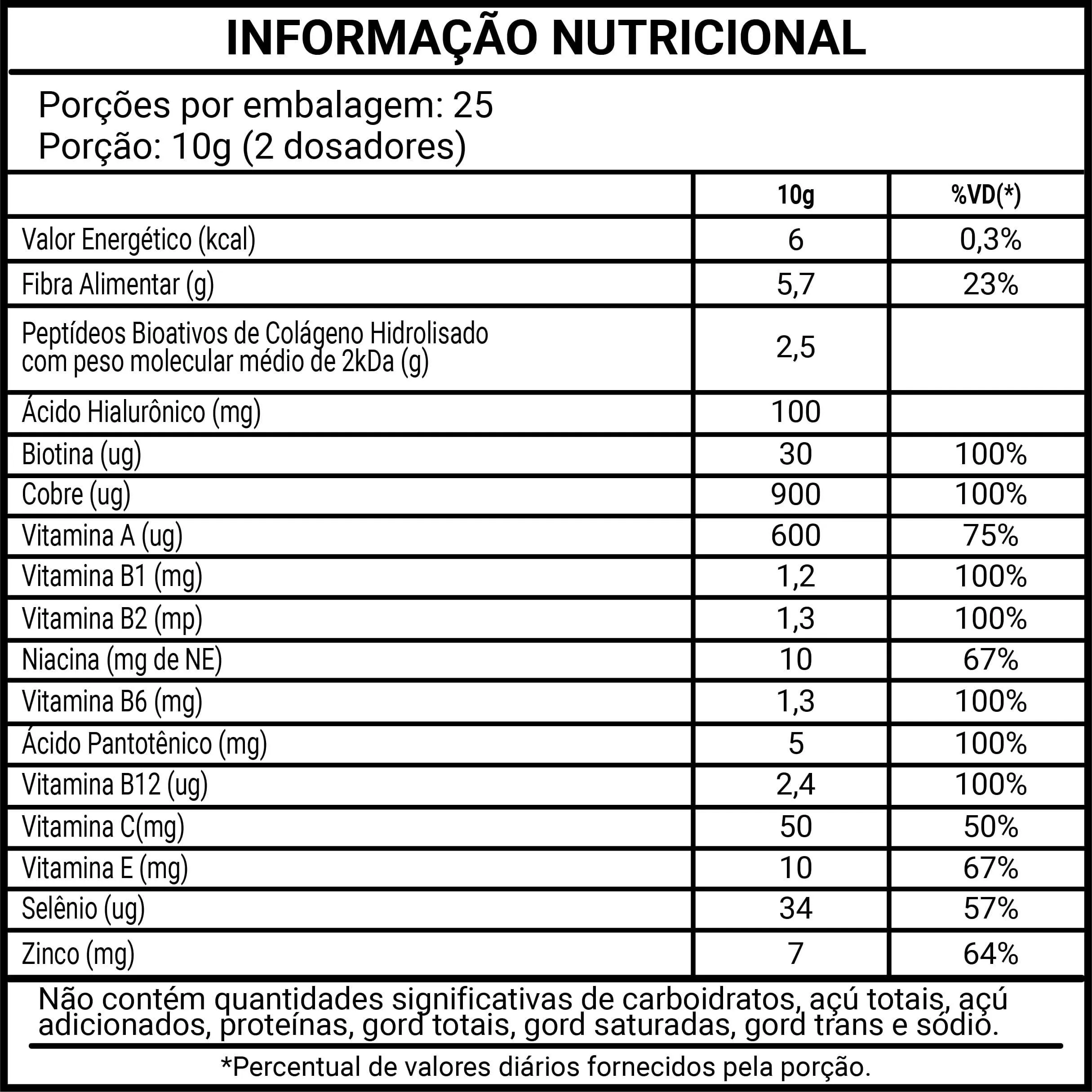 Polidextrose, peptídeos bioativos de colágeno hidrolisado (peso molecular médio de 2kDa), hialuronato de sódio, vitamina c, zinco, vitamina B3, vitamina B5, vitamina e, cobre quelato, vitamina B6, vitamina a, selênio, vitamina B2, vitamina B1, vitamina B7, vitamina B12, aroma natural de tangerina, ácido cítrico, corante natural de urucum, dióxido de silício, glicosídeos de esteviol (stevia).