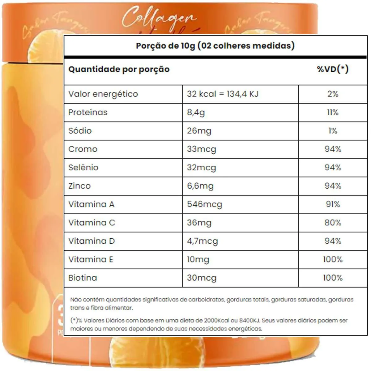 Colágeno hidrolisado, colágeno hidrolisado bioativo, mix de vitaminas e minerais [vitamina c (ácido ascórbico), vitamina e (DL alfa acetato de tocoferol), zinco (sulfato de zinco mono-hidratado), vitamina A (acetato de retinol), cromo (picolinato de cromo), selênio (selenito de sódio), vitamina H (biotina) e vitamina d (colecalcviferol)], ácido cítrico (acidulante) e aroma sintético idêntico ao natural. Edulcorantes: sucralose e estévia. Não contém gluten. Instruções de uso