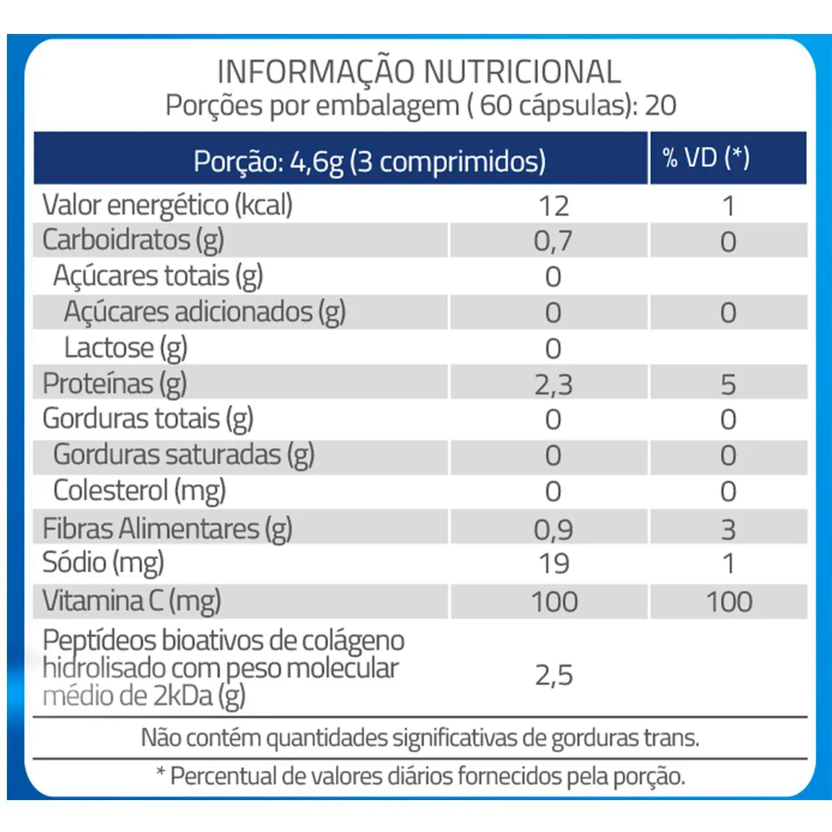 colágeno Verisol + vitamina c Catarinense 60 cápsulas RECOMENDAÇÃO DE USO: Recomenda-se ingerir 3 comprimidos ao dia. Este produto é indicado para indivíduos adultos maiores de 19 anos. Este produto não é um medicamento. Não exceder a recomendação diária de consumo indicada na embalagem. Mantenha fora do alcance de crianças. Este produto não deve ser consumido por gestantes, lactantes e crianças. CUIDADOS DE CONSERVAÇÃO: Antes e após aberto, os comprimidos devem ser mantidos em sua embalagem original (frasco). Guardar o produto à temperatura ambiente (entre 15°C e 30°C), ao abrigo da luz, bem fechado e protegido da umidade. Se o lacre estiver violado, recuse o produto. Contém dessecante à base de sílica. INGREDIENTES: Peptídeos bioativos de colágeno hidrolisado com peso molecular médio de 2kDa, amido modificado, ascorbato de sódio, agente de massa celulose microcristalina (INS 460i), estabilizante croscarmelose sódica (INS 468), glaceantes: álcool polivinílico (INS 1203), talco (INS 553iii), hidroxipropilmetilcelulose (INS 464); corantes: dióxido de titânio (INS 171), óxido de ferro amarelo (INS 172iii), laca de alumínio com amarelo de quinoleína. Dispensado de registro conforme Resolução RDC 27/2010. Este produto é indicado para indivíduos com 19 anos ou mais. Este produto não é um medicamento. Não exceder a recomendação diária de consumo indicada na embalagem. Mantenha fora do alcance de crianças. Este produto não deve ser consumido por gestantes, lactantes e crianças. NÃO CONTÉM GLÚTEN.