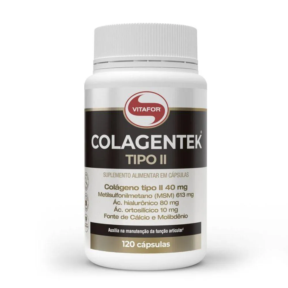 colágeno tipo II não desnaturado, atua diretamente na manutenção da integridade estrutural das articulações, sendo ideal para quem busca qualidade de vida, especialmente atletas, idosos ou pessoas com desgaste articular.Benefícios:Auxilia na redução de dores nas articulaçõesFavorece a regeneração da cartilagemContribui para maior flexibilidade e mobilidadeAlta concentração: 790mg por cápsula120 cápsulas – rendimento para até 4 meses de uso???? Recomendação de uso:Consumir conforme orientação de um profissional da saúde. Indicado para adultos.O Colagentek Tipo II 790mg com 120 cápsulas é um suplemento alimentar especialmente formulado para promover a saúde das articulações, cartilagens e mobilidade. Com colágeno tipo II não desnaturado, atua diretamente na manutenção da integridade estrutural das articulações, sendo ideal para quem busca qualidade de vida, especialmente atletas, idosos ou pessoas com desgaste articular.