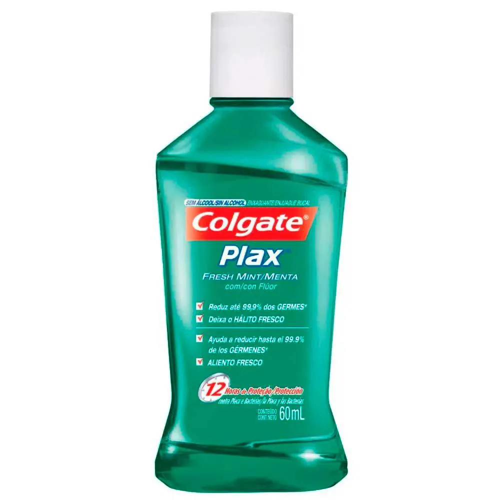 Colgate Enxaguante Bucal Plax Fresh Mint 60ml. Enxaguante Bucal Colgate Plax Fresh Mint proporciona uma boca saudável e fresca por muito mais tempo. Reduz até 99% dos germes, proporciona gengiva mais saudável e intenso hálito fresco. Possui fórmula com flúor para proteção anticárie. Tudo isso com 12 horas de proteção.