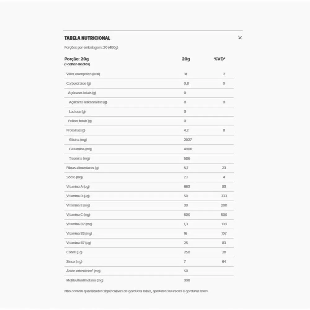 Informação Nutricional Collagen Gut (400g) - Essential NutritionPorção de 20g (1 colher-medida)Quantidade por porção%VD(*)Valor energético55kcal=231kJ3%Carboidratos0,7g0%Glicose0g**Frutose0g**Sacarose0g**Polióis0g**Proteínas11g22%Gorduras totais0g0%Gorduras saturadas0g0%Gorduras trans0g**Fibra alimentar5,7g23%Sódio0mg0% A663mcg111%Riboflavina1,3mg100%Niacina16mg100% C500mg1111% D50mcg1000% E30mg300%Biotina25mcg83%Cobre250mcg28%Zinco7,0mg100%Glicina2927mg**Glutamina4000mg**Treonina586mg**Ácido ortosilícico50mg**Metilsulfonilmetano (MSM)300mg*** % Valores Diários com base em uma dieta de 2.000Kcal ou 8400kJ. Seus valores diários podem ser maiores ou menores dependendo das suas necessidades energéticas. Obs: Pode haver pequenas variações na informação nutricional, de acordo com o sabor.