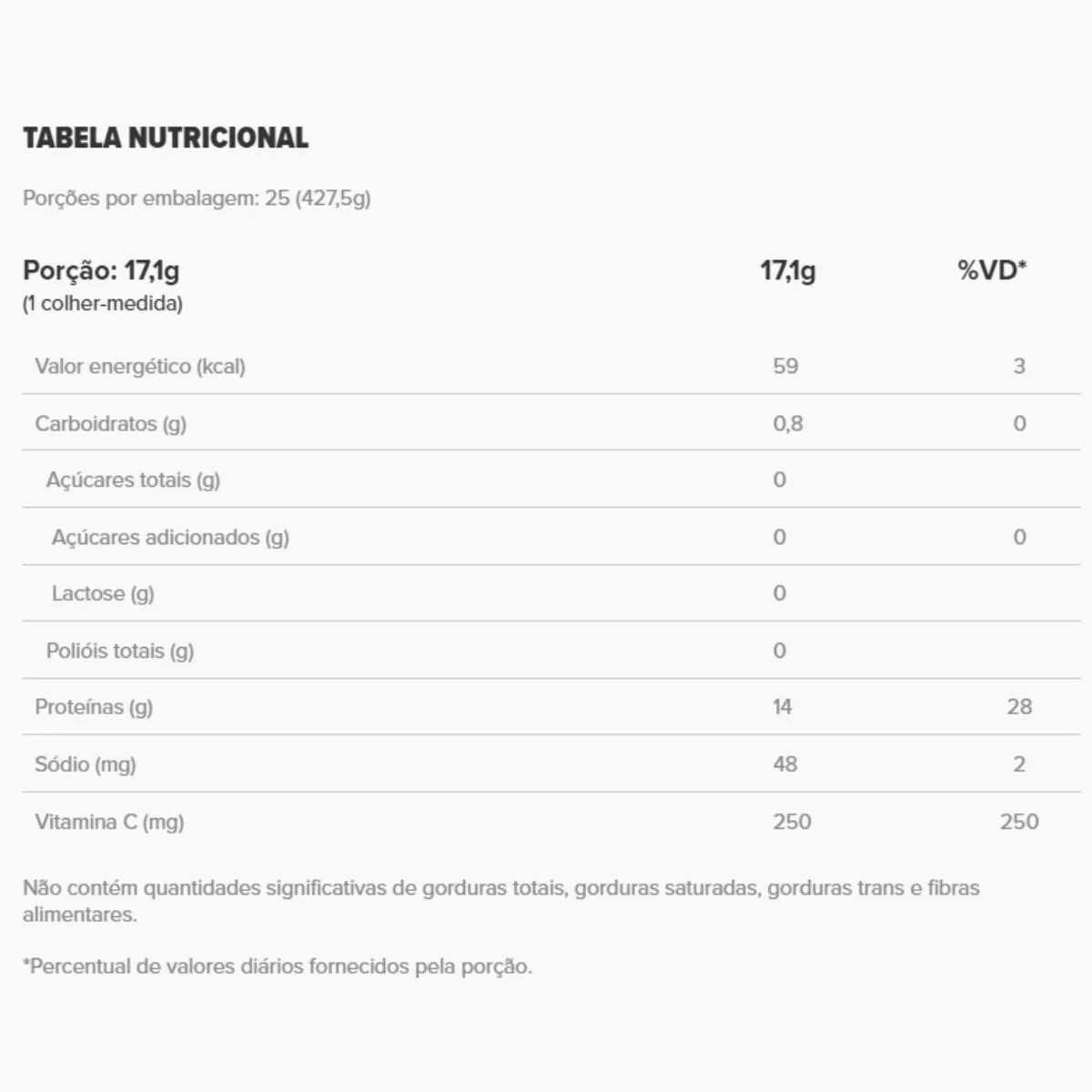 A fórmula reúne colágeno hidrolisado, proteínas isoladas, vitaminas e minerais que auxiliam no aporte nutricional, sem adição de açúcar, glúten ou corantes artificiais. Adoçado com ingredientes naturais, o produto oferece solubilidade rápida e textura suave após misturado.