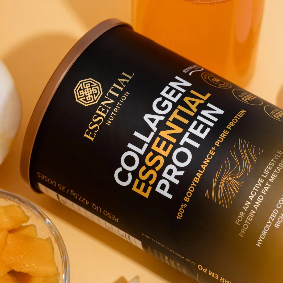 Collagen Protein da Essential Nutrition traz uma lata com 457,5 g, equivalente a 30 doses de um blend de proteínas que mescla peptídeos de colágeno e outras fontes, voltado a quem busca praticidade e aporte de aminoácidos. A embalagem metálica com fechamento hermético assegura preservação do produto.