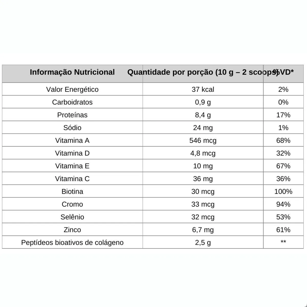 - Suporte nutricional com colágeno 100% hidrolisado de alta pureza.