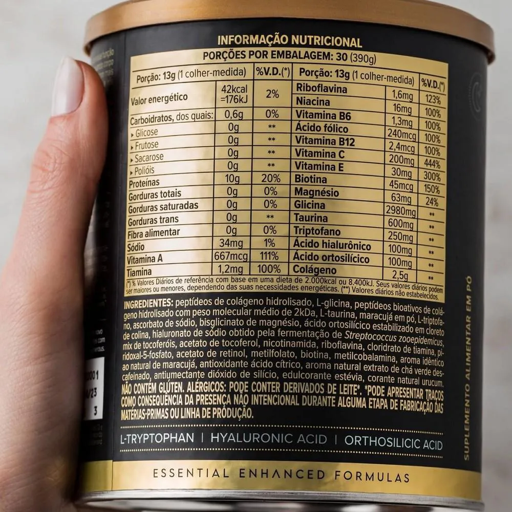 Peptídeos de colágeno hidrolisado, L-glicina, peptídeos bioativos de colágeno hidrolisado com peso molecular médio de 2kDa, L-taurina, maracujá em pó, L-triptofano, ascorbato de sódio, bisglicinato de magnésio, ácido ortosilícico estabilizado em cloreto de colina, hialuronato de sódio obtido pela fermentação de Streptococcus zooepidemicus, mix de tocoferóis, acetato de tocoferol, nicotinamida, riboflavina, cloridrato de tiamina, piridoxal-5-fosfato, acetato de retinol, metilfolato, biotina, metilcobalamina, aroma idêntico ao natural de maracujá, antioxidante ácido cítrico, aroma natural extrato de chá verde descafeinado, antiumectante dióxido de silício, edulcorante estévia e corante natural urucum. NÃO CONTÉM GLÚTEN. ALÉRGICOS: PODE CONTER DERIVADOS DE LEITE*. * PODE APRESENTAR TRAÇOS COMO CONSEQUÊNCIA DA PRESENÇA NÃO INTENCIONAL DURANTE ALGUMA ETAPA DA FABRICAÇÃO DAS MATÉRIAS-PRIMAS OU DA LINHA DE PRODUÇÃO.