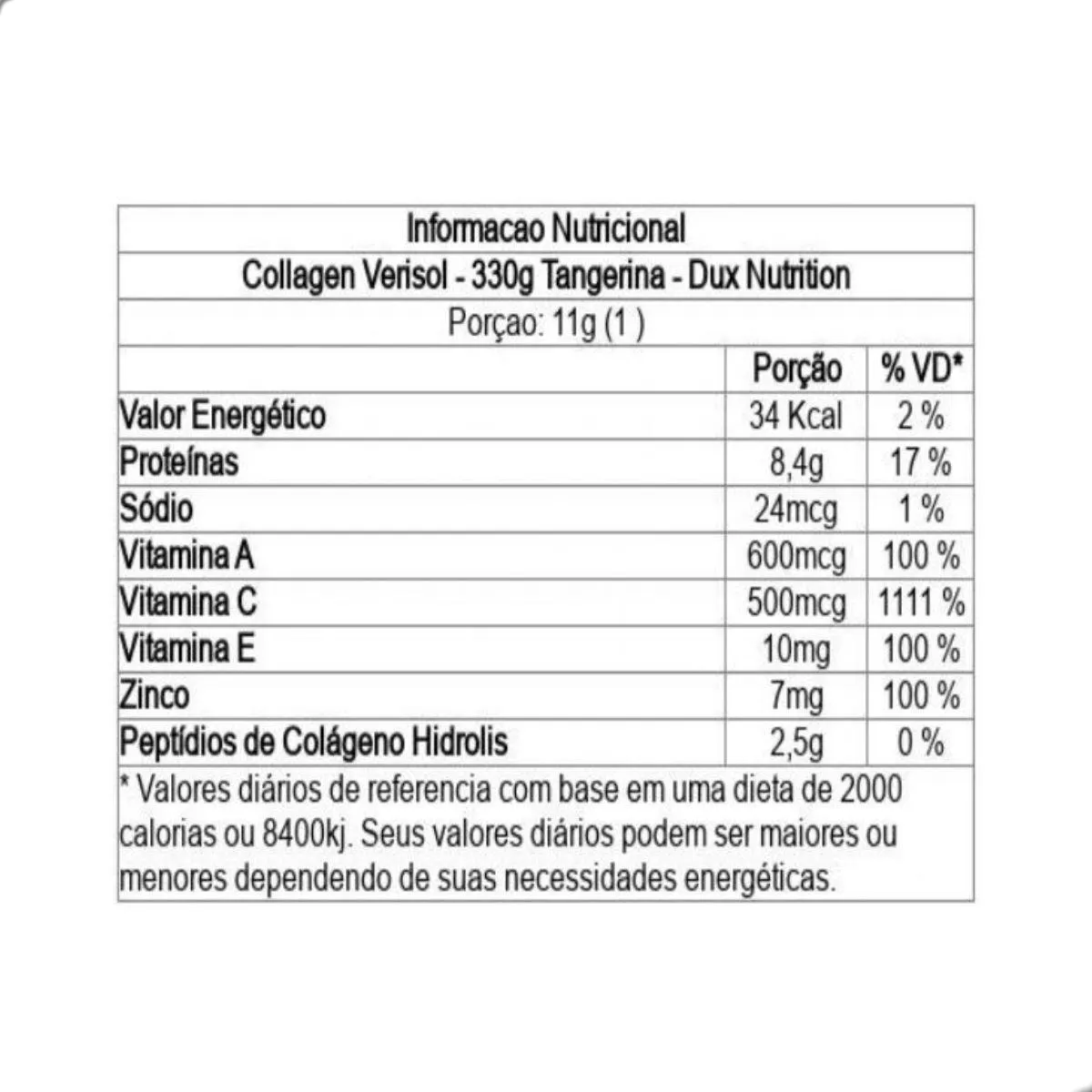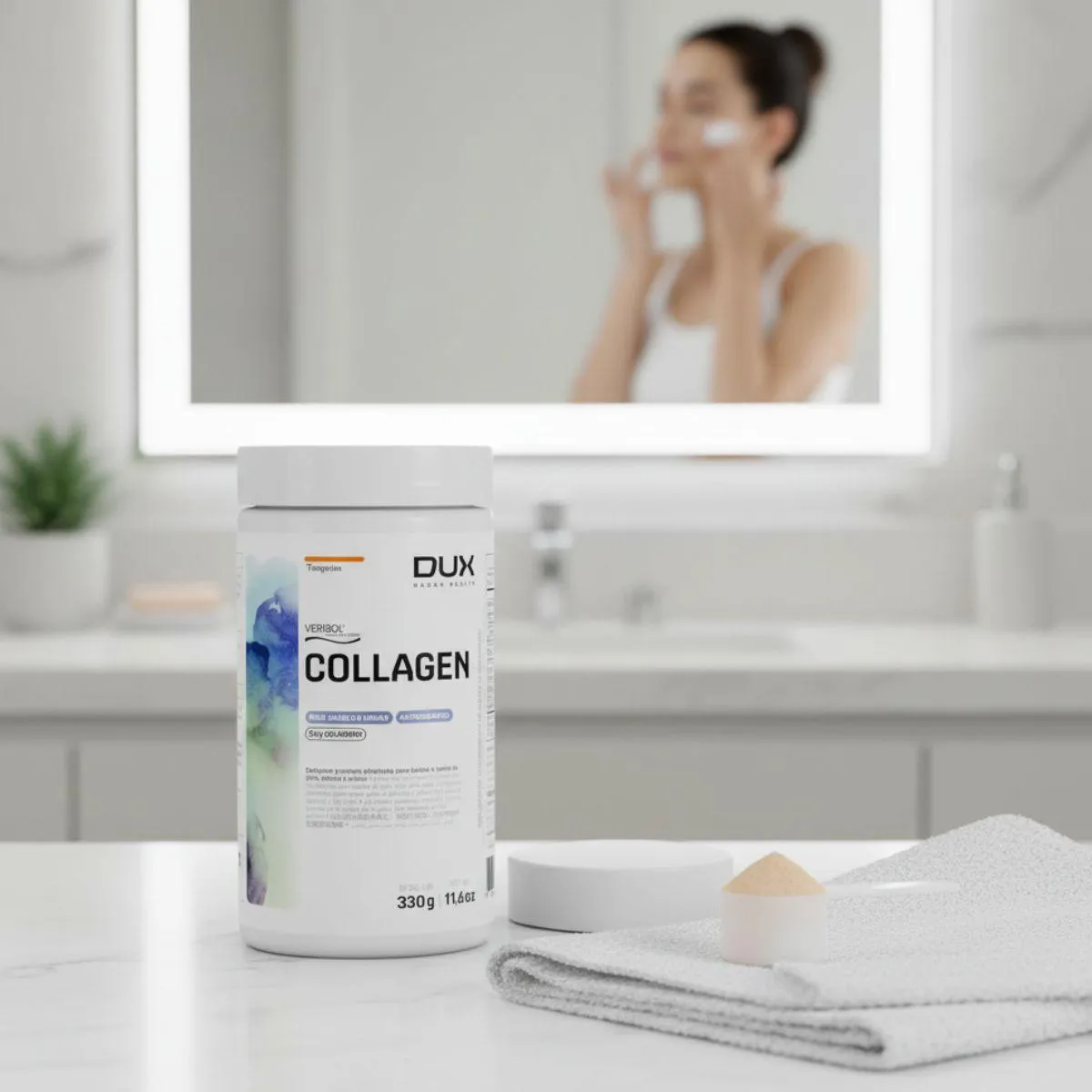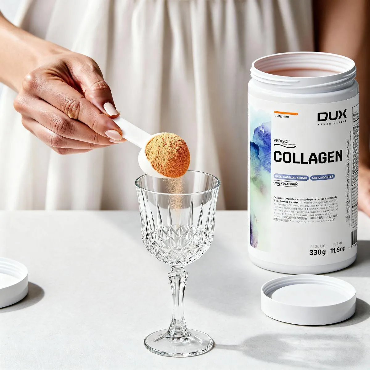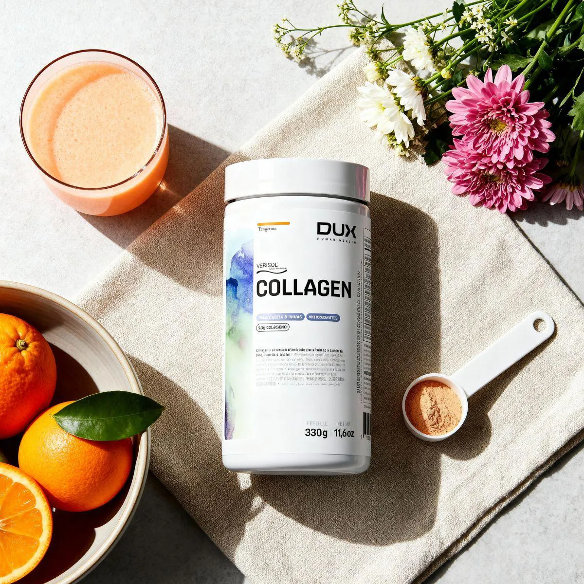 O Collagen Verisol Dux foi desenvolvido para apoiar a saúde de pele, cabelos e unhas. Este suplemento em pó contém peptídeos bioativos de colágeno Verisol®, reconhecidos por sua absorção eficiente, além de vitaminas C, A e zinco, que contribuem para a síntese de colágeno e proteção antioxidante. Não possui açúcar, glúten ou lactose.