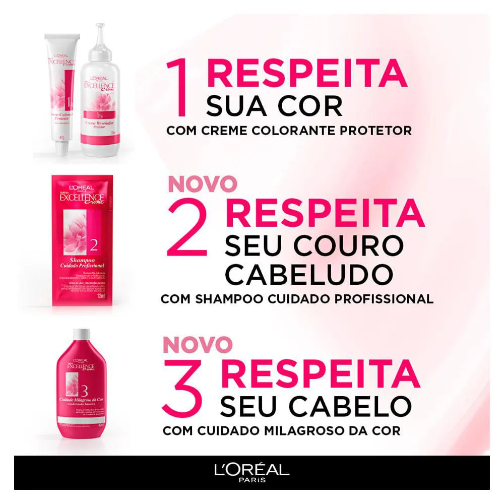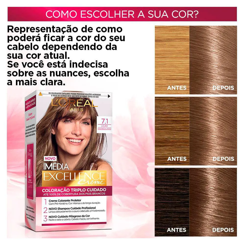 A Coloração Imédia Excellence é um produto de coloração permanente que oferece tripla proteção para os cabelos. Enriquecida com Ionene G, Pro-Keratina e Ceramida, a coloração restaura, fortalece e protege a fibra capilar enquanto cobre 100% dos fios brancos.