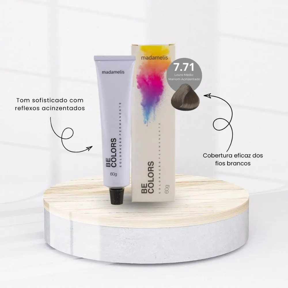 A Coloração Madamelis Be Colors Louro Médio Marrom Acizentado 7.71 60 g combina a sofisticação do marrom com reflexos acinzentados, resultando em um tom moderno e levemente frio. É ideal para quem deseja um louro médio mais neutro, elegante e com acabamento profissional.Para Qual Tipo de cabelo é Indicado?
