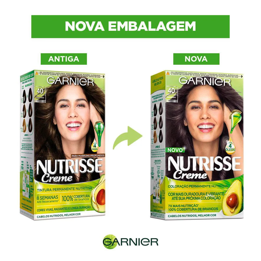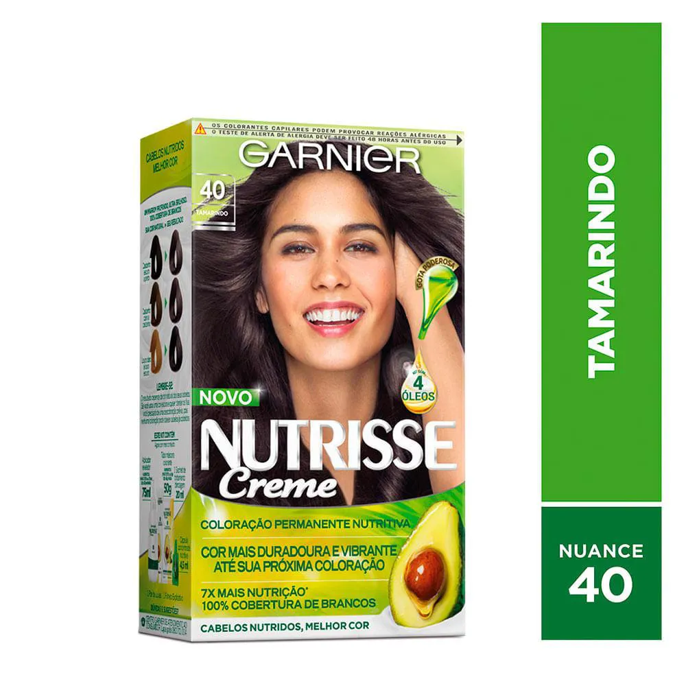 Garnier Nutrisse Creme 40 TAMARINDO é a coloração permanente que garante cores vivas, radiantes e de longa duração. Para marrons profundos, é a única com Blindagem Nutritiva, que fixa a cor profundamente e por mais tempo.