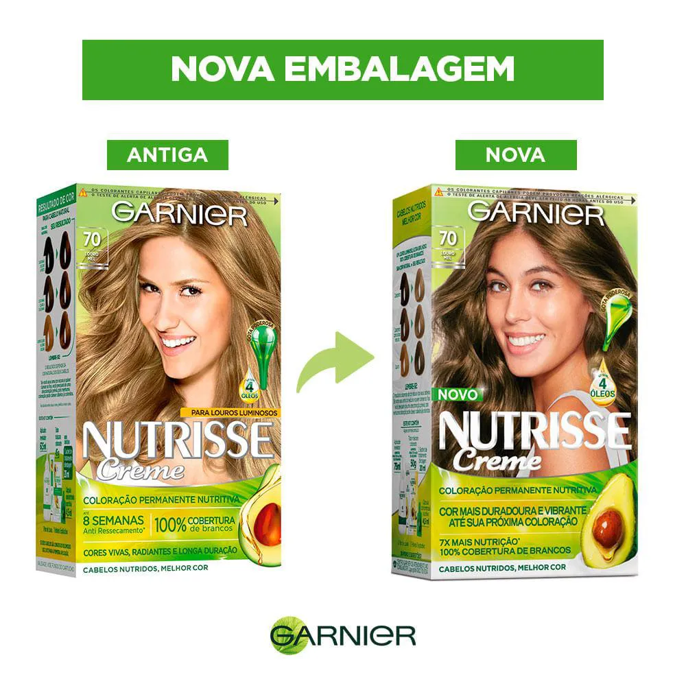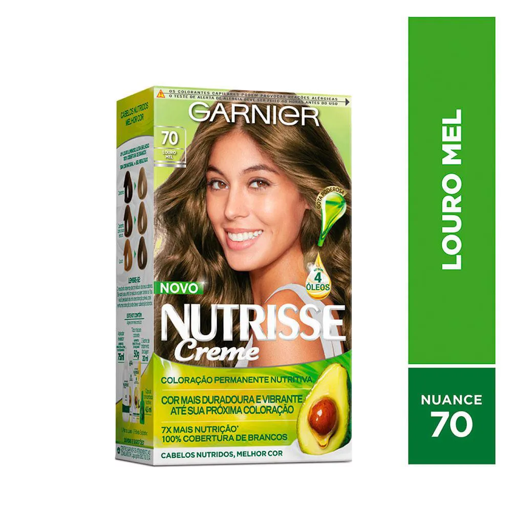 Garnier Nutrisse Creme 70 LOURO MEL é a coloração permanente que garante cores vivas, radiantes e de longa duração. Para louros luminosos, é a única com Blindagem Nutritiva, que fixa a cor profundamente e por mais tempo.