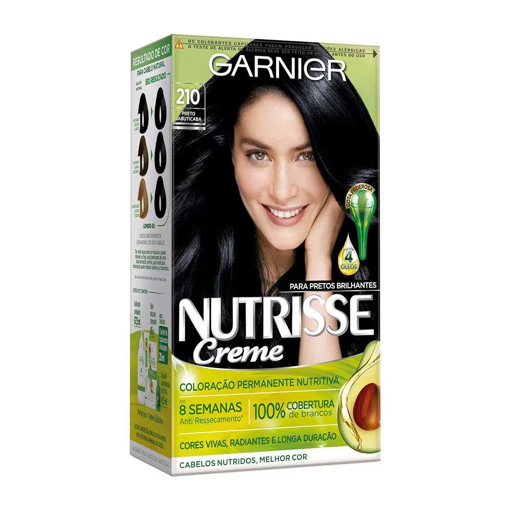 Garnier Nutrisse Creme 210 PRETO JABUTICABA é a coloração permanente que garante cores vivas, radiantes e de longa duração. Para pretos brilhantes, é a única com Blindagem Nutritiva, que fixa a cor profundamente e por mais tempo.