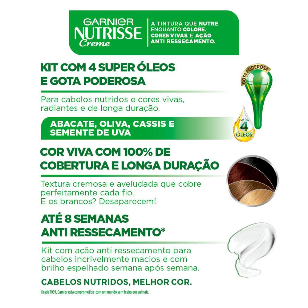 Garnier Nutrisse Creme 52 MARROM AÇAÍ é a coloração permanente que garante cores vivas, radiantes e de longa duração. Para marrons profundos, é a única com Blindagem Nutritiva, que fixa a cor profundamente e por mais tempo.
