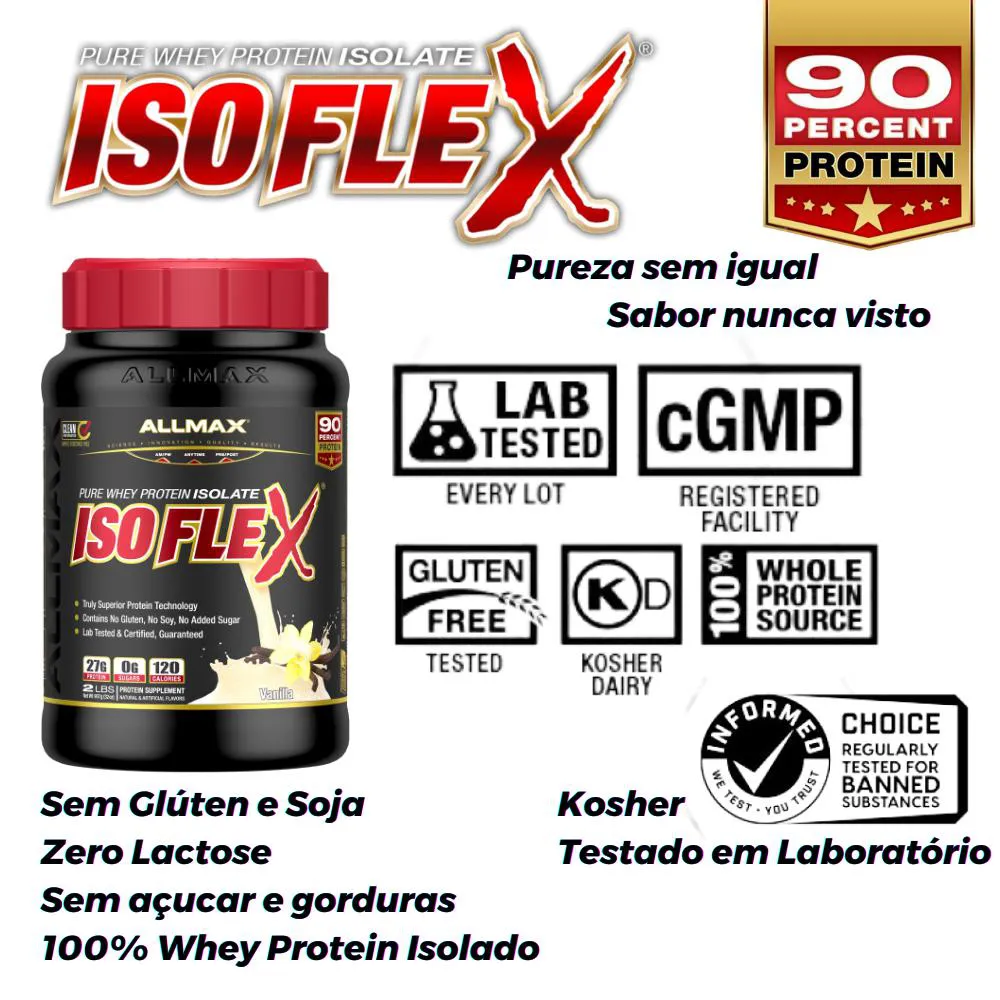 ISOFLEX® - WHEY PROTEIN VERDADEIRAMENTE SUPERIOR ISOFLEX é o melhor em sabor e qualidade. Não apenas o ISOFLEX possui uma nova aparência e um ótimo sabor, utilizando tecnologia de ponta, mas também é whey protein isolado do puro soro do leite. O ISOFLEX é significativamente mais baixo em lactose, gordura, açúcar e carboidratos, em comparação com os WPIs regulares! Se você está procurando a proteína de mais alta qualidade, mais premium e de absorção mais rápida, não procure além do ISOFLEX: um verdadeiro Whey Protein Isolado superior. O ISOFLEX não contém absolutamente NENHUM Concentrado de Soro. Os concentrados têm níveis mais altos de gordura e açúcares com uma porcentagem menor de proteína e menor biodisponibilidade do que os isolados. Enquanto outras marcas usam concentrados, os usuários do ISOFLEX sabem que os isolados têm uma porcentagem de proteína superior e não aceitarão misturas não isoladas. Isso mesmo, Isolado Puro de Proteína do Soro do Leite em suas mãos, oferecendo incríveis 90% de pureza de proteína! 27 g de Proteína Pura que foi testada em laboratório, certificada e aprovada. Devido à alta qualidade e pureza do ISOFLEX, você obtém uma das absorções de proteína mais rápidas que o mercado tem a oferecer. Tome o ISOFLEX a qualquer hora e em qualquer lugar que você precisar. QUALIDADE SUPERIOR O ISOFLEX foi produzido em uma instalação registrada na cGMP, é testado e certificado como livre de glúten e proteína kosher certificada. Além disso, o ISOFLEX é certificado como um produto testado pelo Informed-Choice para substâncias proibidas, conforme indicado pelo selo de aprovação em cada embalagem de ISOFLEX da ALLMAX. O MELHOR ISOLADO DE PROTEÍNA DE SORO DO MERCADO RAZÃO HÍBRIDA DE ISOLADO (HRI) - TECNOLOGIA DE FILTRAÇÃO DE ÍONS BETA-LACTOGLOBULINA 53,8% ALFA-LACTOALBUMINA* 20,3% GLICOMACROPEPTÍDEO 18,8% BIPEPTÍDEOS E TRIPEPTÍDEOS 4,3% IMUNOGLOBULINA 2,5% ALBUMINA DE SORO BOVINO 1,6% LACTOFERRINA 0,1% *15% a mais do que os Isolados Típicos. O ISOFLEX utiliza uma tecnologia única de extração de proteína chamada Filtração de Íons de Razão Híbrida (HRI). Uma combinação de duas tecnologias de purificação de isolados incorporada em uma proporção específica para produzir um pó de Isolado de Proteína do Soro do Leite verdadeiramente superior e ultra puro. A tecnologia de ponta HRI permite que o ISOFLEX mantenha um rendimento de proteína excepcionalmente alto, ao mesmo tempo que mantém frações de soro bioativas aprimoradas. Este processo é uma das razões pelas quais o Isoflex é considerado por muitos como o melhor isolado de proteína de soro no mercado mundial. O ISOFLEX NÃO CONTÉM ABSOLUTAMENTE NENHUM WHEY CONCENTRADO! Isso mesmo, Puro Isolado de Proteína de Soro em suas mãos, proporcionando incríveis 90% de proteína! Apenas frações de proteína nativas e intactas. 27 g de Proteína Pura que foi testada em laboratório, certificada e aprovada. O ISOFLEX agora possui a tecnologia SCOOP-LOCK™ Foram-se os dias em que você tinha que cavar através de sua proteína para pegar a colher. O SCOOP-LOCK foi ergonomicamente projetado para travar seu scoop em um único lugar! E ele está bem ali no topo do seu ISOFLEX quando você o abre! O Scoop-Lock está disponível em todos os produtos ISOFLEX, ALLWHEY Gold, ALLWHEY Classic e HEXAPRO, e é exclusivo da ALLMAX. Procure pela nova e resistente tampa Ergo-Lid™ nos produtos ALLMAX com o Scoop-Lock™ interno! O SABOR QUE VOCÊ DESEJA - OS RESULTADOS QUE VOCÊ EXIGE A primeira coisa que realmente diferencia o ISOFLEX de qualquer outro whey protein do mercado é o seu sabor. Ele é incrível! E com 3 sabores deliciosos para escolher, com certeza haverá um que satisfaça suas papilas gustativas. O ISOFLEX está disponível em frascos de 2 lb e 5 lb (Baunilha, Chocolate e Morango) Perguntas Frequentes: POSSO USAR O ISOFLEX COM OUTROS SUPLEMENTOS? Sim, você pode. Dependendo de seus objetivos, o Isoflex complementa muitos outros produtos da AllMax Nutrition para ajudar você a levar seu treinamento ao próximo nível. O Isoflex é altamente versátil e é considerado uma base ideal, ou seja, pode ser usado com praticamente todos os outros suplementos. Se você está tentando perder peso ou tonificar, experimente combinar o RapidCuts Shredded com o Isoflex. Se você está tentando ganhar massa ou peso, o Aminocore e a Glutamina são excelentes produtos para experimentar, além do próprio Isoflex. COMO DEVO TOMAR O ISOFLEX? USO SUGERIDO PELO FABRICANTE: Combine uma medida de 30g de pó de proteína Isoflex com 1/2 copo ou 120 ml de água, suco ou leite (a maioria escolhe água ou leite desnatado), dependendo da sua preferência, a qualquer momento durante o dia em que você precisa de um impulso de proteína. A maioria dos atletas com necessidades elevadas de proteína duplica cada porção com 2 medidas de Isoflex e cerca de 1 copo (300 ml de água), fornecendo 54 gramas de proteína pura. ISOLADO DE PROTEÍNA DE SORO VS. CONCENTRADO: O QUE FAZ DO ISOFLEX SUPERIOR A OUTROS WHEY PROTEINS NO MERCADO? A primeira coisa que realmente diferencia o Isoflex de qualquer outro whey protein no mercado é o seu sabor. Ele é incrível! Em segundo lugar, e mais importante, ele foi formulado apenas com a mistura mais superior disponível - isolado de proteína do soro do leite. Muitos outros whey proteins no mercado usam concentrados e outras misturas inferiores que contêm apenas 30-80% de proteína e incluem níveis mais altos de carboidratos, lactose (açúcar do leite) e gorduras. Além disso, o perfil de macronutrientes do Isoflex é excepcional e fornece incríveis 27 gramas de proteína pura! O ISOFLEX VAI ME DAR MÚSCULOS GRANDES E VOLUMOSOS? Para aqueles que estão tentando perder peso ou tonificar, tomar suplementos de proteína como o Isoflex não vai auxiliar da formação de músculos grandes e volumosos. Na verdade, o Isoflex pode até te ajudar a 