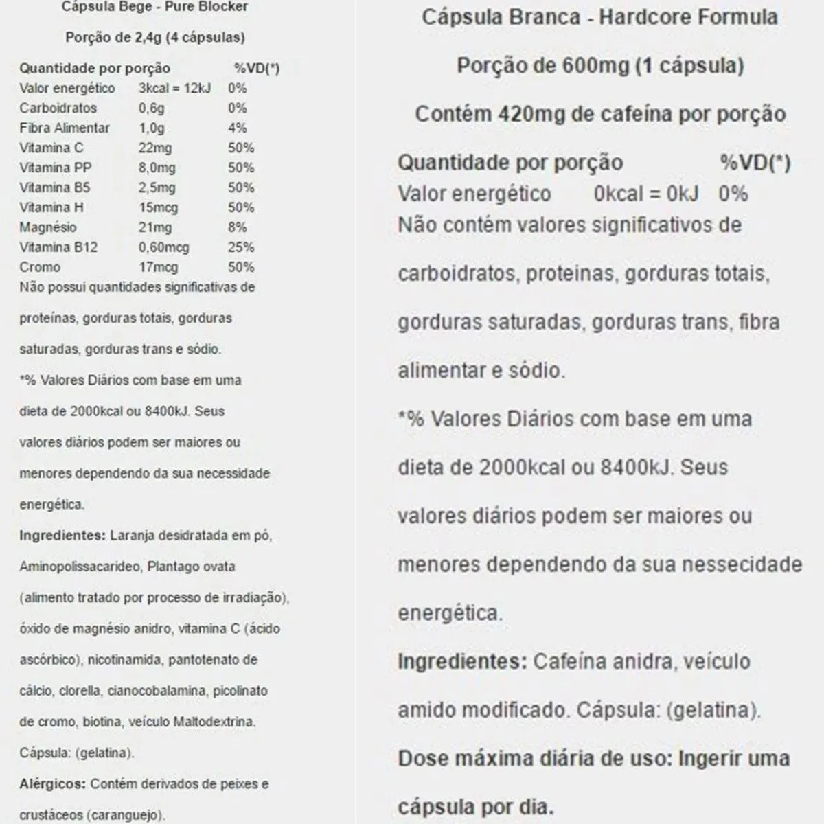 Cápsula Pure Blocker (incolor): Laranja desidratada em pó, aminopolissacarídeo, Plantago ovata (alimento tratado por processo de irradiação), óxido de magnésio anidro, vitamina c, nicotinamida, pantotenato de cálcio, clorella, cianocobalamina, picolinato de cromo, biotina, veículo: maltodextrina. Cápsula (gelatina). Cápsula de Cafeína Sineflex / Dynamic Focus (bordeaux): Cafeína. Veículo: amido. Cápsula (gelatina, corantes artificiais INS 122, 171, 129, 133, 110). ALÉRGICOS: CONTÉM DERIVADOS DE PEIXES E CRUSTÁCEOS (CARANGUEJO). NÃO CONTÉM GLÚTEN