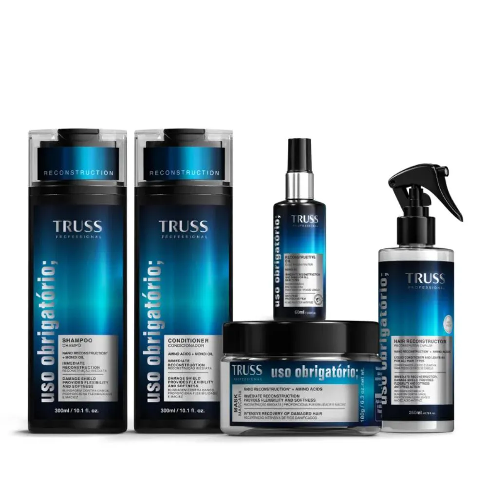 Este kit TRUSS com 5 produtos traz shampoo, condicionador, Máscara, spray e Óleo Uso Obrigatório; proporcionam uma experiência completa para cabelos danificados e ressecados. Com fórmula avançada e fragrância duradoura, a dupla age em sinergia para restaurar a saúde, a maciez e o brilho dos seus fios.