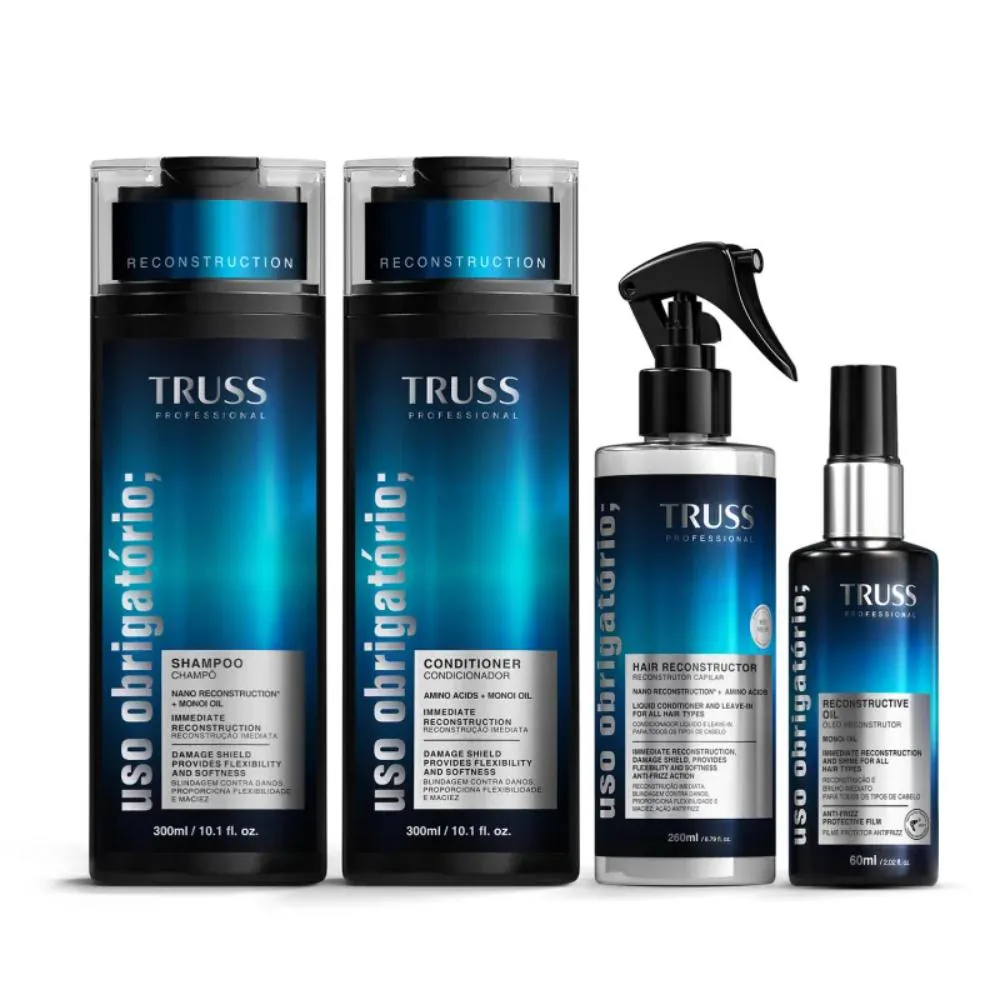 Este kit TRUSS com 4 produtos traz shampoo, condicionador, spray e Óleo Uso Obrigatório; proporcionam uma experiência completa para cabelos danificados e ressecados. Com fórmula avançada e fragrância duradoura, a dupla age em sinergia para restaurar a saúde, a maciez e o brilho dos seus fios.
