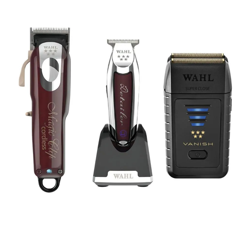 Combo Wahl Magic Clip Cordless + Detailer + Shaver Finale BivoltMaquina De Cortar cabelo Magic Clip Cordless WahlMaquina de acabamento e finalização Vanish Gold WahlMáquina De Acabamento Wahl Detailer Cordless Silver Lithium