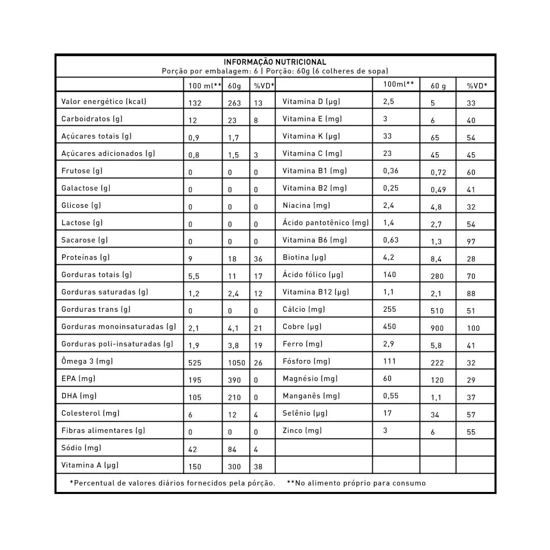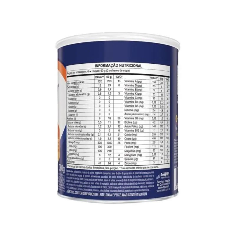 Fórmula nutricional com densidade energética de 1,32kcal/mL, isenta de lactose, com alto teor proteico* (18g/porção), com leucina** e rico em ômega-3*** (DHA e EPA). Sem sabor (versátil, podendo ser utilizado em receitas doces e salgadas).*Porção diária de 60g. / **Naturalmente encontrada em proteínas lácteas. / ***Este não é um alimento baixo ou reduzido em gorduras saturadas