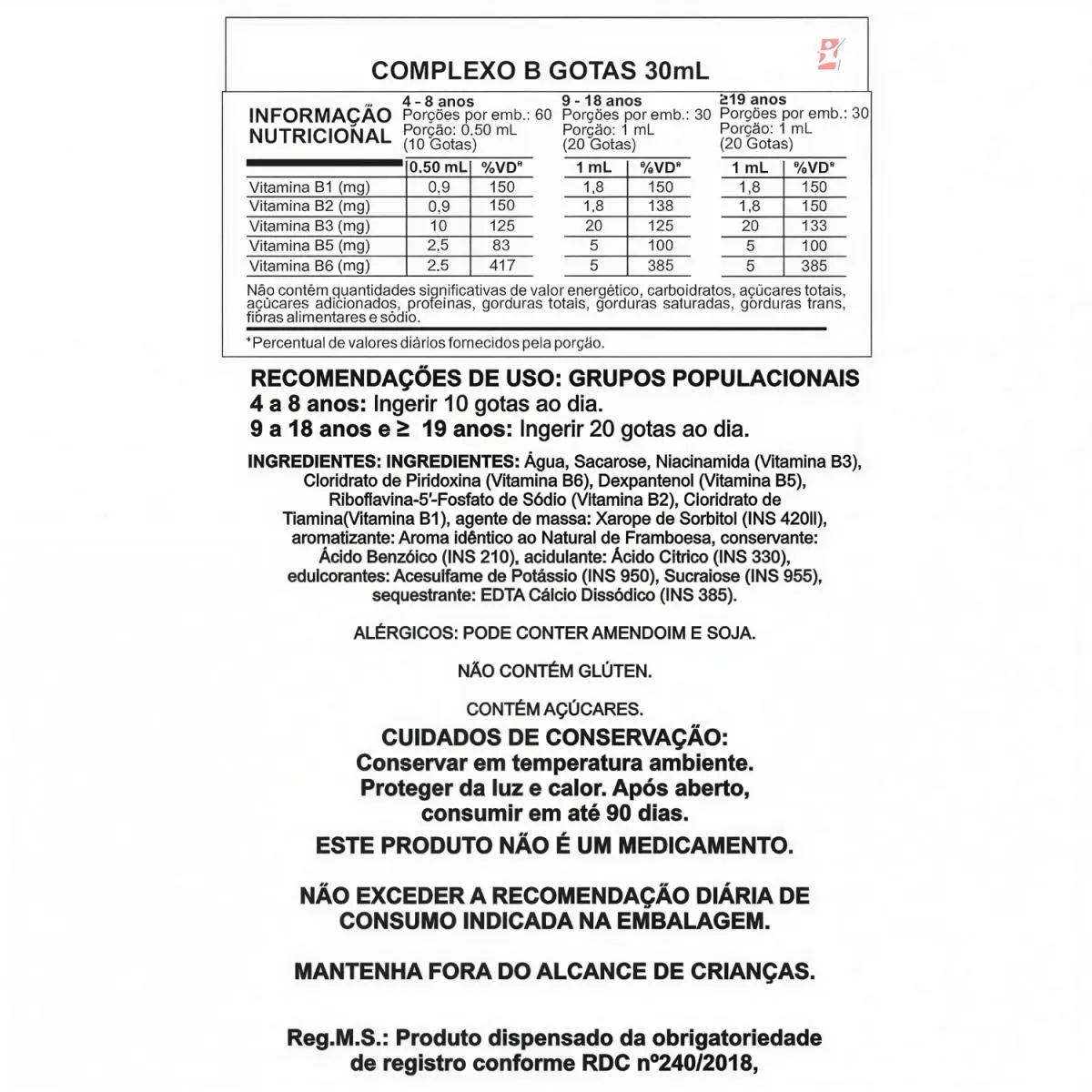 COMPLEXO B EM GOTAS COM 5 VITAMINAS 30ML – ARTE NATIVA   DESCRIÇÃO A niacina contribui para a manutenção da pele e auxilia no metabolismo de proteínas, carboidratos e gorduras. A vitamina B6 auxilia no funcionamento do sistema imune e na formação de células vermelhas do sangue. Ácido pantotênico auxilia no metabolismo energético. A riboflavina auxilia na formação de células vermelhas do sangue e é um antioxidante que auxilia na proteção dos danos causados pelos radicais livres. A tiamina auxilia no metabolismo de proteínas, carboidratos e gorduras e no metabolismo energético.   BENEFÍCIOS - 5 Vitaminas do Complexo B; - Alto rendimento; - Uso adulto e pediátrico; - Auxilia no metabolismo energético; - Auxilia no metabolismo de proteínas, carboidratos e gorduras; - Contribui para a manutenção da pele, olhos e cabelos; - Ajuda na atividade física; - Não contém glúten.   SUGESTÃO DE USO 4 a 8 anos: Ingerir 10 gotas ao dia. 9 a 18 anos e ≥ 19 anos: Ingerir 20 gotas ao dia.   TABELA NUTRICIONAL - COMPOSIÇÃO e RECOMENDAÇÕES Anexo nas imagens.   DADOS TÉCNICOS Registro ANVISA – Produto dispensado da obrigatoriedade de registro de conforme RDC nº240/2018. Marca – Arte Nativa. Conteúdo líquido por frasco – 30ml. Rendimento líquido por frasco – conforme o uso.       Peso líquido por frasco – 30g. Peso bruto por frasco – 48g. Peso produto + embalagem(aproximado) – 150g. Código de barras (EAN) – 7898277713272. Dimensões do produto – largura: 4cm; altura: 9,5cm; comprimento: 4cm. Dimensões da embalagem/pacote – largura: 13 cm; altura: 7 cm; comprimento: 16 cm.   ITENS DO ANÚNCIO 1 Unidade do produto: COMPLEXO B EM GOTAS COM 5 VITAMINAS 30ML – ARTE NATIVA. Total – 30ml CADA FRASCO.