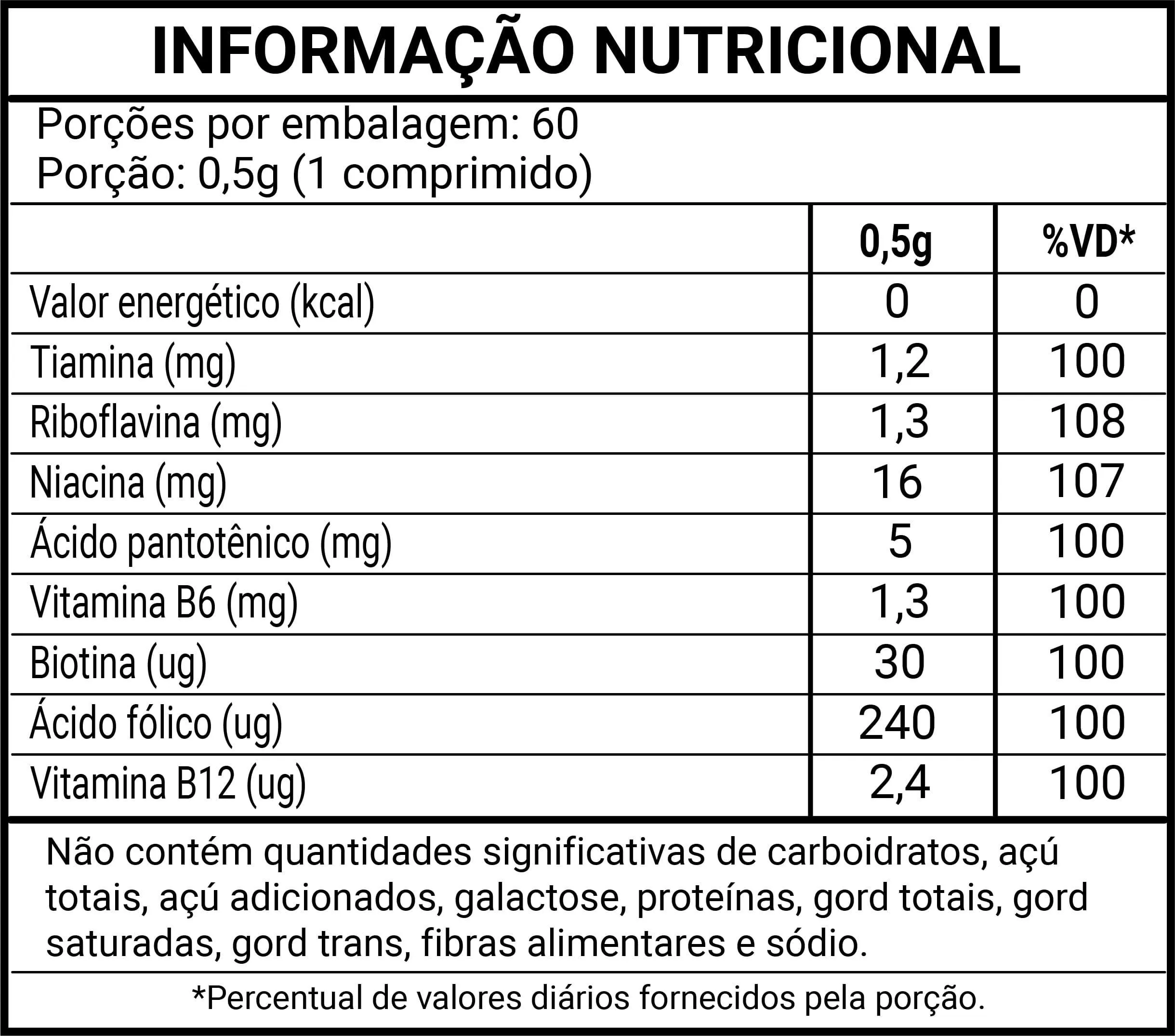 - Ingredientes Ativos: nicotinamida, pantotenato de cálcio, cloridrato de piridoxina, riboflavina, nitrato de tiamina, ácido pteroilmonoglutâmico, biotina, cianocobalamina