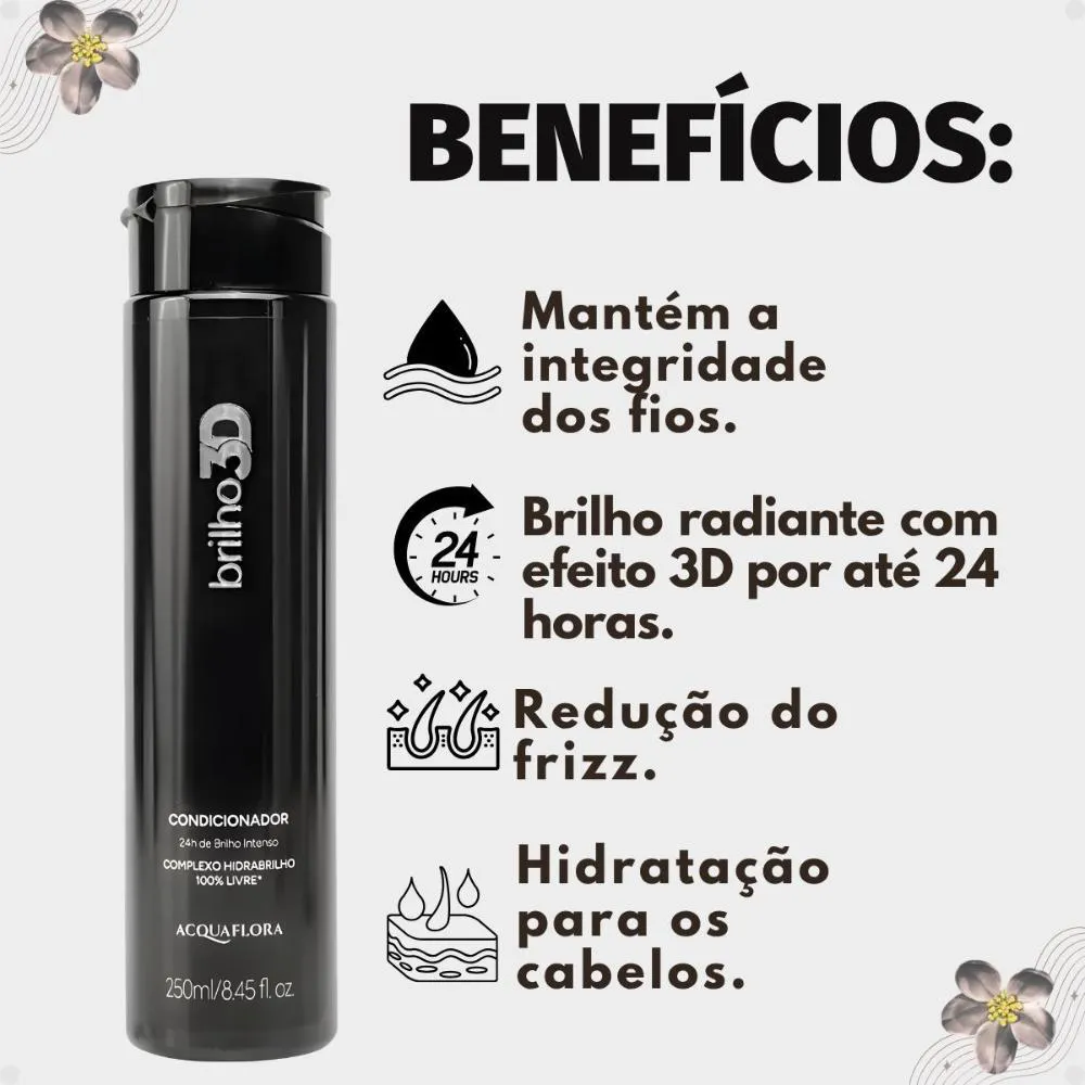 Descubra o segredo para cabelos radiantes com o Condicionador Acquaflora Brilho 3D 250ml. Desenvolvido pela Acquaflora, este condicionador oferece um tratamento capilar completo, promovendo condicionamento instantâneo e uma transformação notável. Seus ativos de alta penetração agem diretamente na fibra capilar, garantindo a integridade dos fios e proporcionando 24h de brilho radiante. Ideal para quem busca leveza, suavidade, hidratação profunda e um controle eficaz do frizz, este produto é a solução perfeita para manter seus cabelos deslumbrantes e protegidos. O Condicionador Acquaflora Brilho 3D não apenas embeleza, mas também cuida. Ele confere um efeito disciplinante e oferece proteção da cor contra os danos causados pelos raios ultravioleta, assegurando que seus cabelos permaneçam vibrantes e saudáveis por mais tempo. Experimente a inovação da Acquaflora e revele um brilho tridimensional que encanta.Benefícios Principais