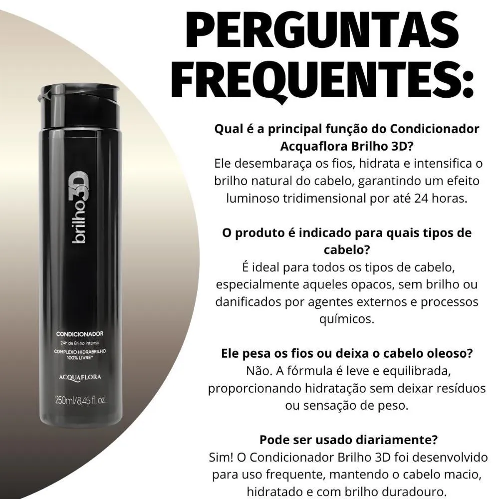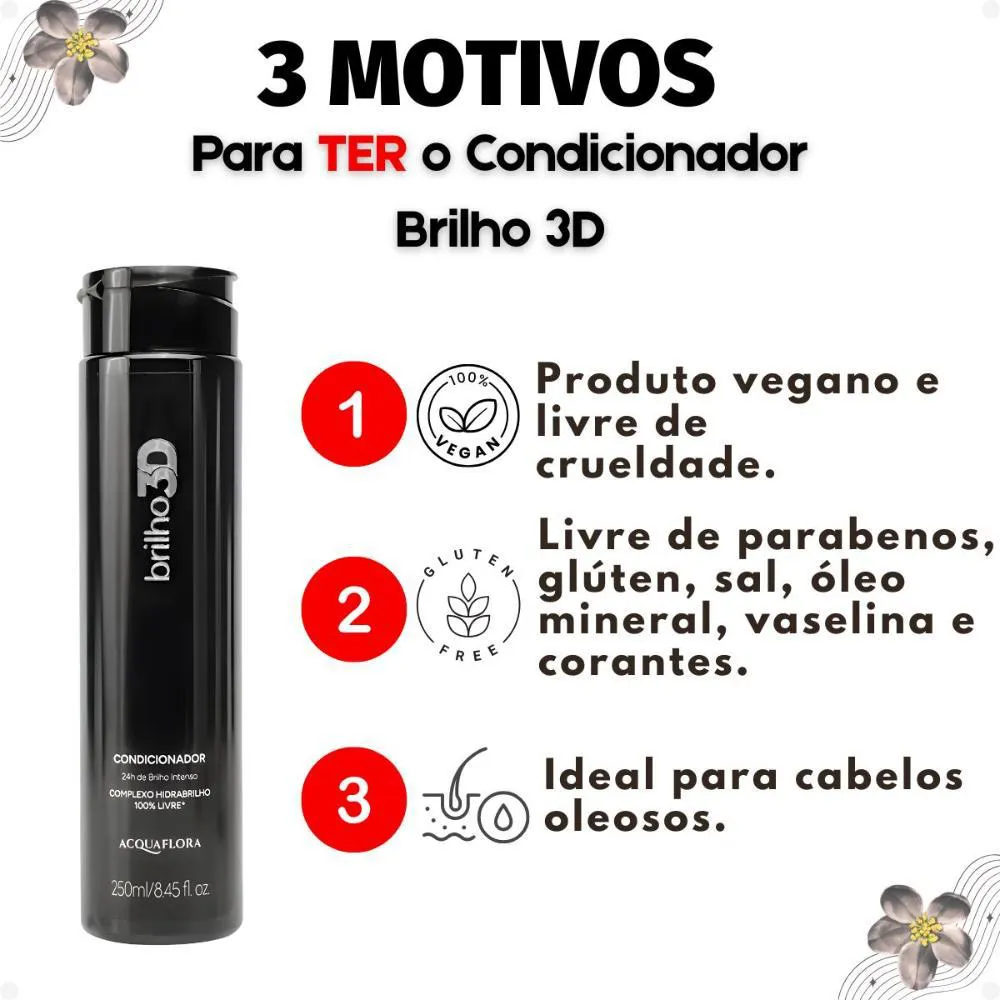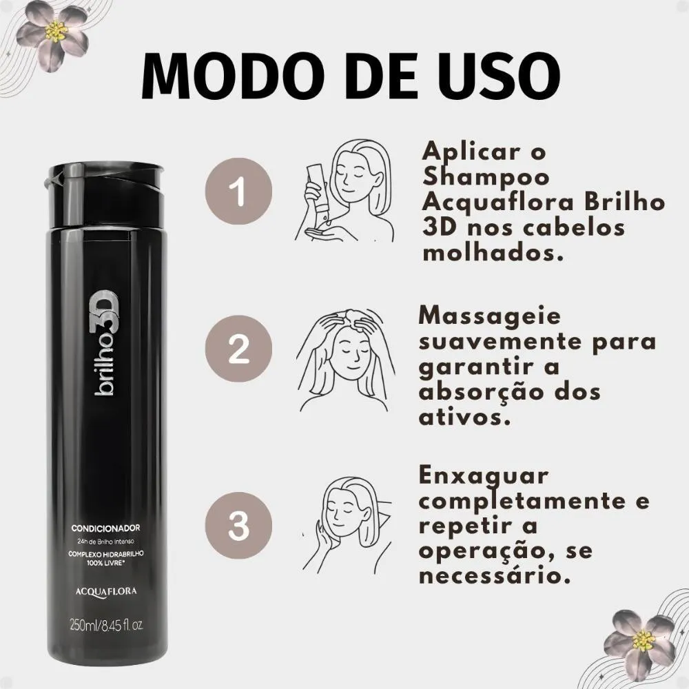 O Condicionador Acquaflora Brilho 3D é perfeito para o uso diário, proporcionando um tratamento completo para cabelos que necessitam de brilho, hidratação e controle do frizz. Ideal para manter a vitalidade e a beleza dos fios em qualquer ocasião, especialmente para quem busca proteção da cor e um aspecto saudável e disciplinado.Modo de Uso/Aplicação