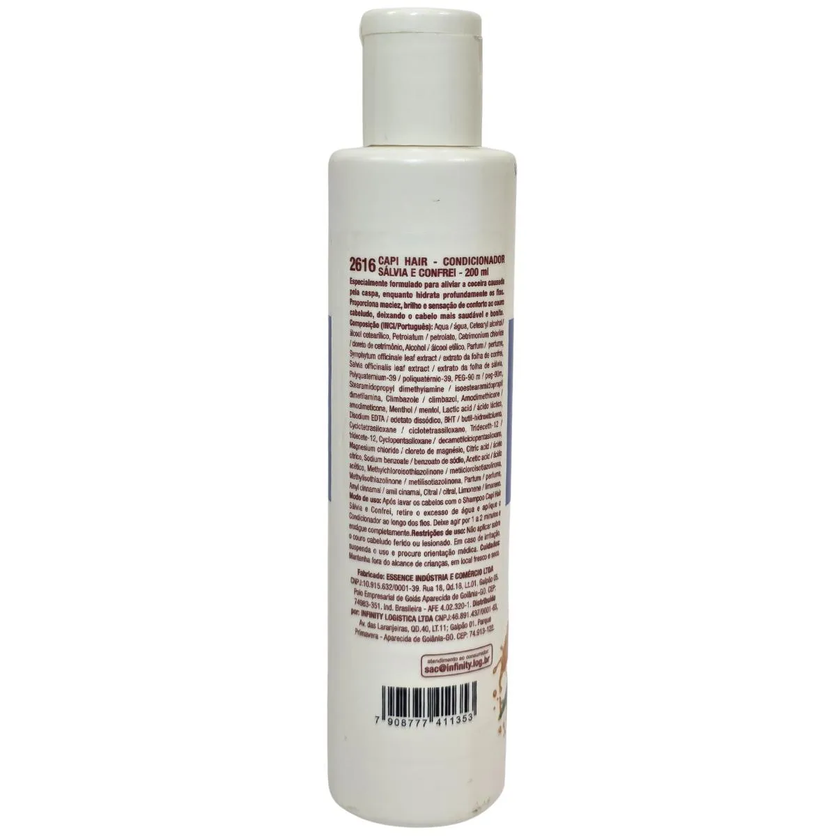 Modo de Uso: Após lavar os cabelos com o shampoo Capi Hair Sálvia e Confrei, retire o excesso de água e aplique o Condicionador ao longo dos fios. Deixe agir por 1 a 2 minutos e enxágue completamente.