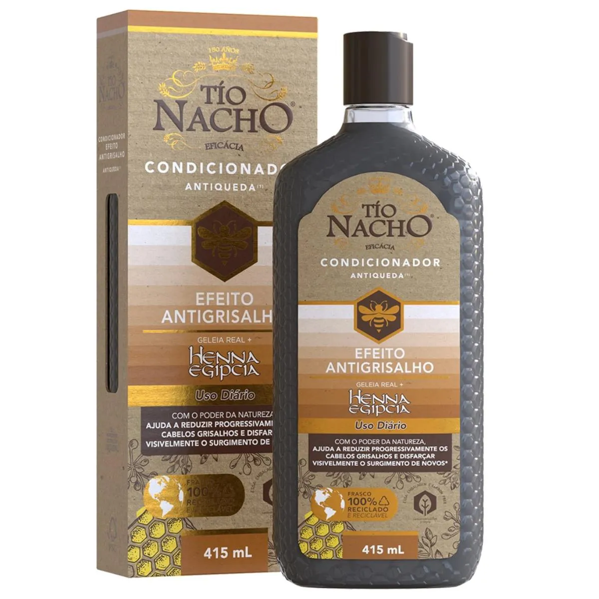 Com o poder da natureza, a linha Tío Nacho Antigrisalho ajuda a reduzir progressivamente os cabelos grisalhos e ocultar visivelmente a aparência de novos*. *Este produto adiciona cor aos cabelos grisalhos gradativamente, não os cobre 100% e não atua ao nível do bulbo capilar. Resultados visíveis a partir de 30 aplicações da linha completa (shampoo + condicionador).Benefícios e diferenciais