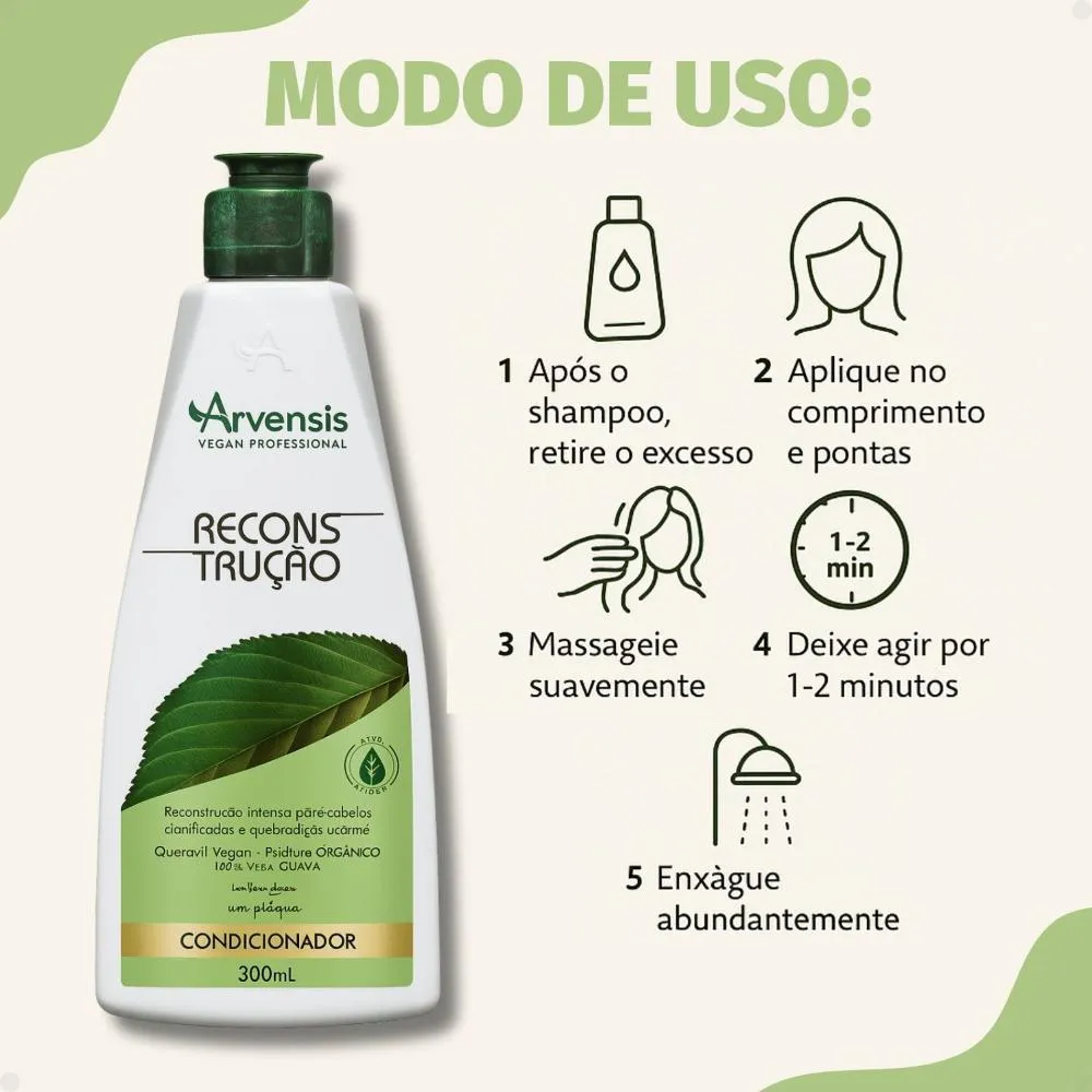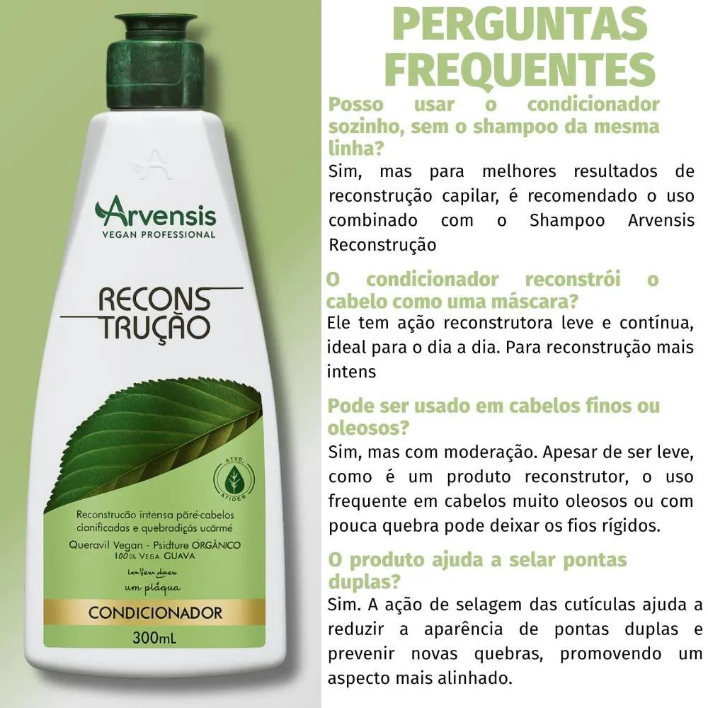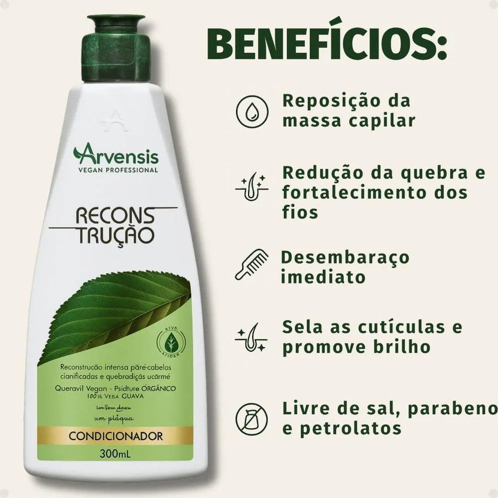 condicionador Arvensis Reconstrução 300ml O Reestruturação intensa e resistência para os fios frágeis. O Condicionador Arvensis Reconstrução foi desenvolvido para cabelos danificados, quebradiços ou quimicamente tratados, que precisam de força, reposição de massa e revitalização profunda. Sua fórmula com proteínas vegetais, aminoácidos e ativos reconstrutores age diretamente na fibra capilar, ajudando a recuperar a estrutura dos fios e prevenir a quebra. Com textura cremosa e ação emoliente, o condicionador desembaraça com facilidade, sela as cutículas e devolve aos fios o brilho, a maciez e a resistência perdidos por danos térmicos ou químicos. Ideal para ser usado na etapa de reconstrução do cronograma capilar. Além disso, é um produto livre de parabenos, petrolatos, corantes e sal, o que o torna uma excelente opção para quem busca cuidados mais naturais e eficazes.