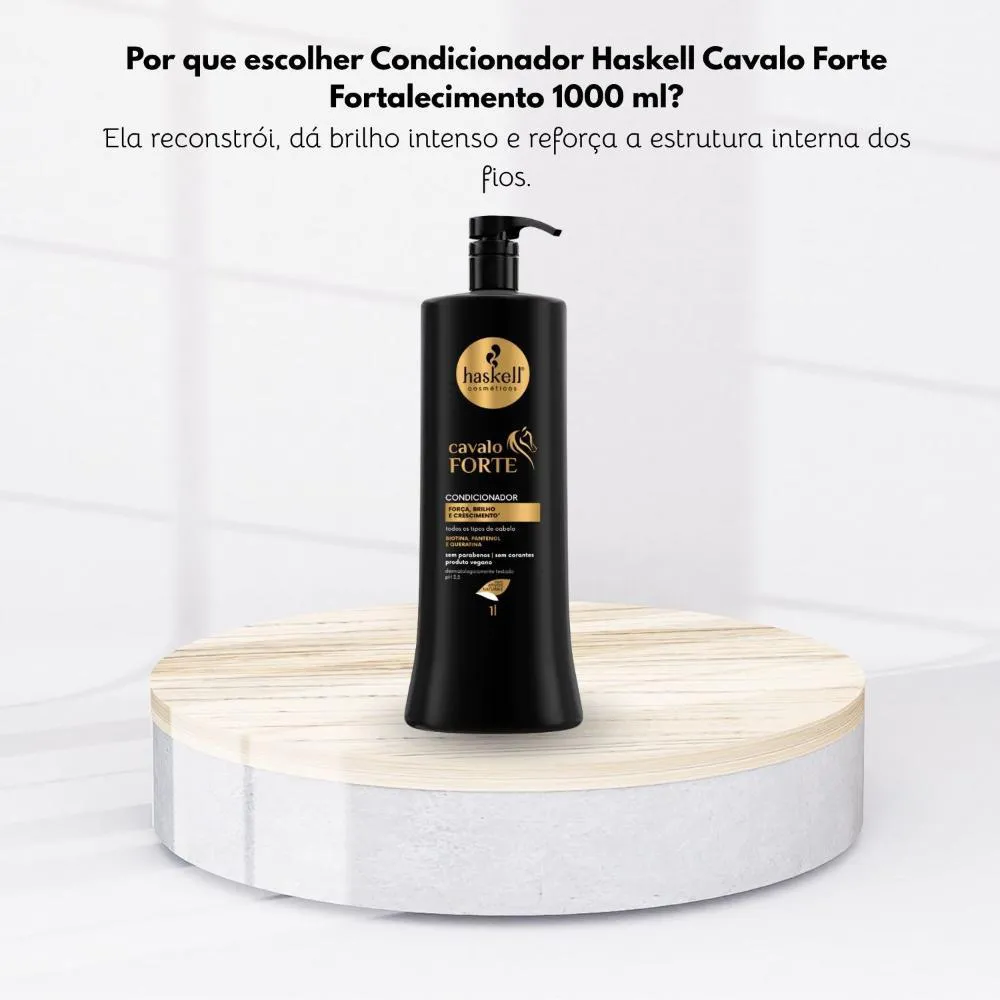 O Condicionador Haskell Cavalo Forte Fortalecimento 1000ml foi desenvolvido para fortalecer e nutrir os fios, proporcionando maior resistência, brilho e maciez. Sua fórmula com biotina, pantenol e queratina vegetal promove reparação profunda, sela cutículas e reduz a quebra, auxiliando no crescimento saudável.Para Qual Tipo de cabelo é Indicado?