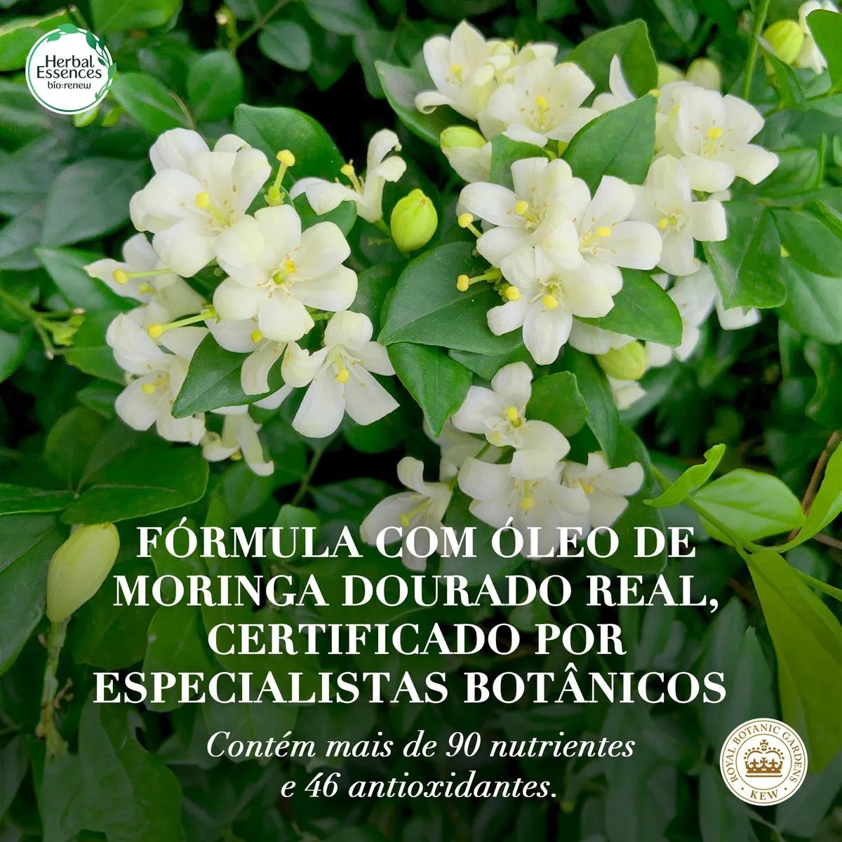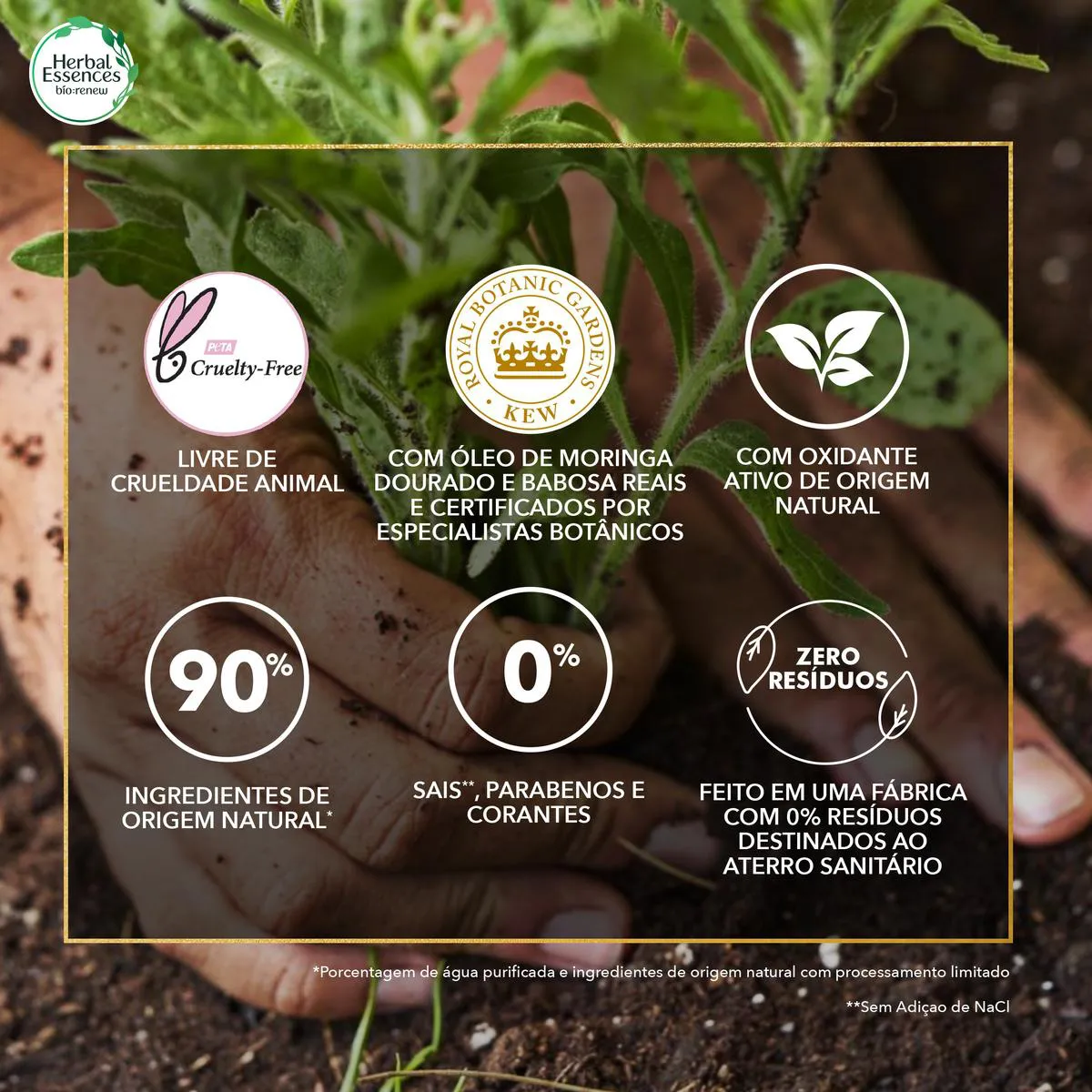 O Condicionador Herbal Essences Bio:Renew Óleo de Moringa Dourada é um produto inspirado na natureza para proporcionar suavidade. Livre de parabenos, silicones e corantes, ele conta com uma fórmula com botânicos reais certificados pelo Kew, autoridade mundial em plantas. Feito com 90% ingredientes de origem natural com base no óleo extraído das sementes de Moringa, que contém mais de 90 nutrientes e 46 antioxidantes.