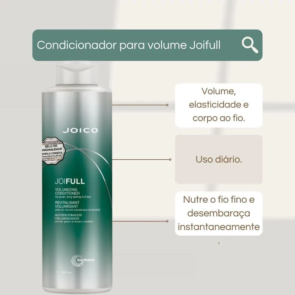 O Condicionador Joico Joifull Volumizing 1 Litro é um produto para Cabelos desenvolvido para cuidado profissional, auxiliando na manutenção da saúde, brilho e maciez dos fios conforme a proposta da linha Joico.Para Qual Tipo de cabelo é Indicado?