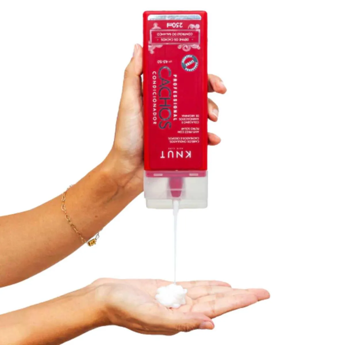 As proteínas milenares da Arginina irão nutrir, disciplinar, alinhar e dar balanço na medida certa! O Blend de Aminoácidos irá estimular a microcirculação dos vasos capilares, equilibrando os nutrientes da raiz até as pontas, traz alívio ao couro cabeludo e hidrata profundamente. O Colágeno Pró V é a proteína responsável pela elasticidade, força e reconstrução da fibra capilar! Cabelos cacheados ainda mais hidratados, macios, maleáveis e com um balanço incrível. Condicionador: Após lavar os cabelos com o shampoo e usar a Máscara KNUT CACHOS, aplique o Condicionador, começando pelas pontas, evitando aplicar no couro cabeludo.Massageie suavemente mecha a mecha, deixe agir por alguns minutos e enxágue.