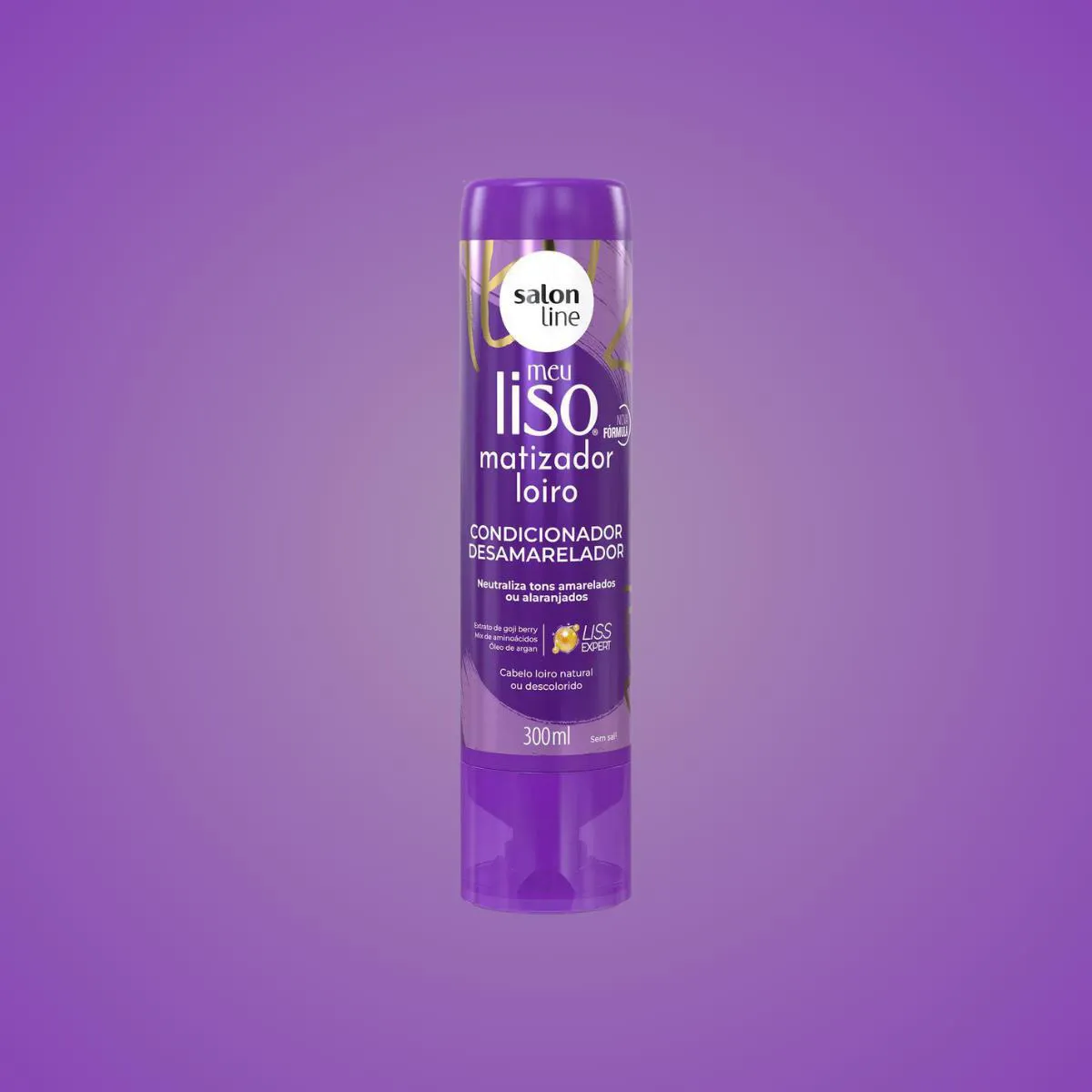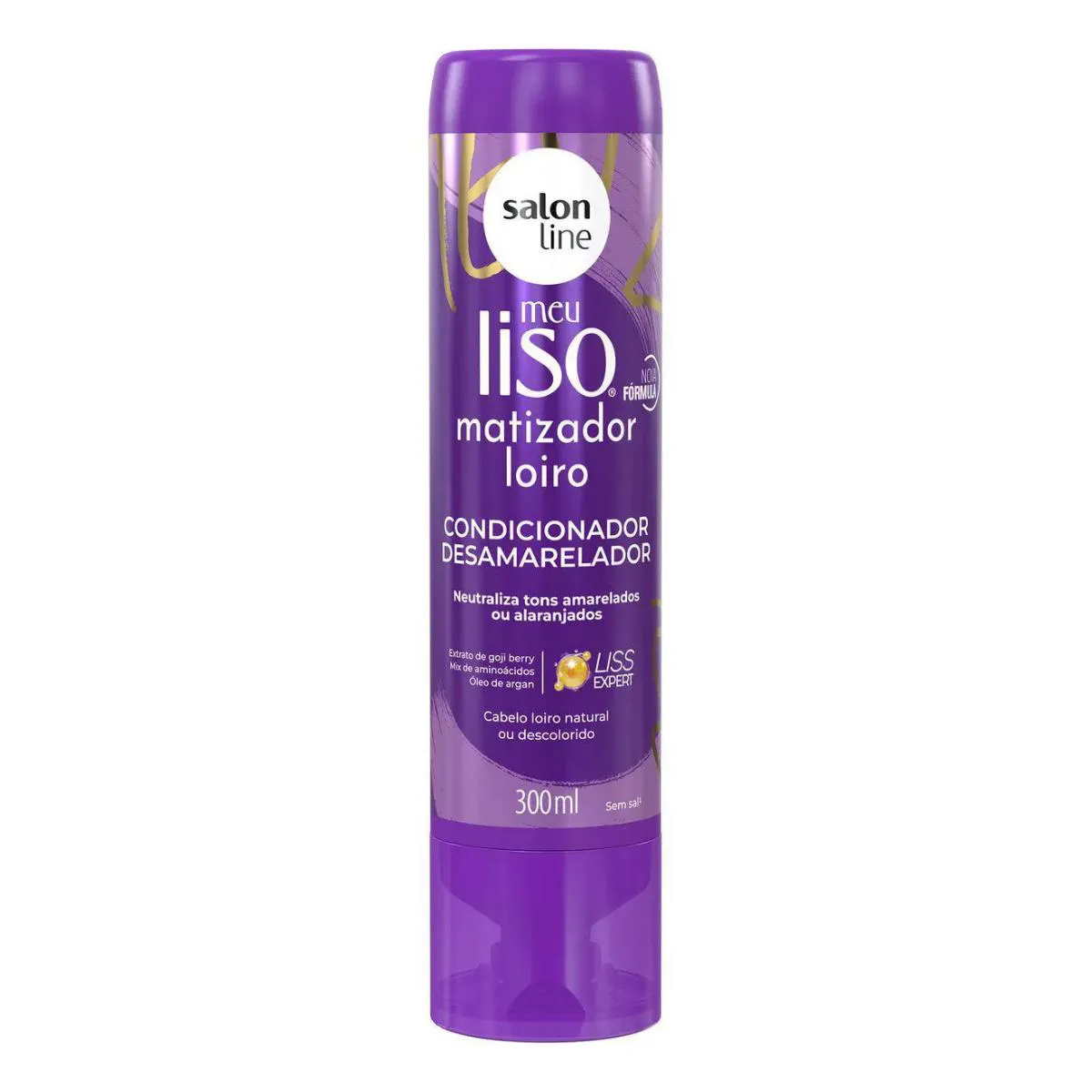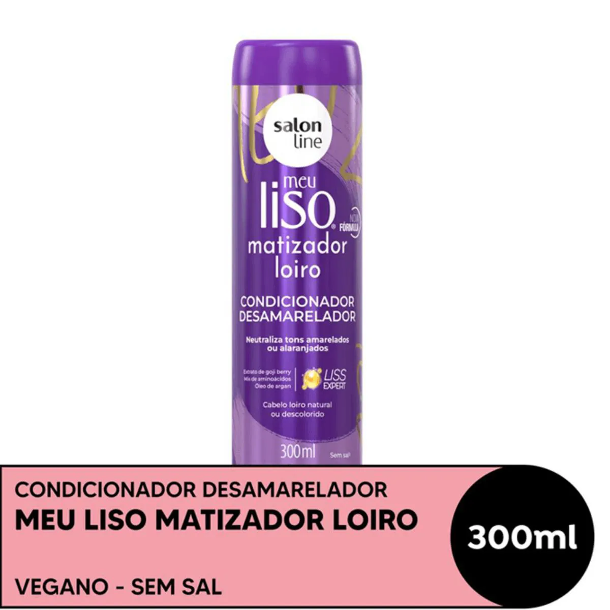 condicionador Meu Liso Matizador Loiro 300 mlO que é e para que serve o condicionador Salon Line Meu Liso Matizador?O Condicionador Meu Liso Matizador Loiro é ideal para loiros naturais ou descoloridos que perderam o tom ideal. Com efeito profissional, ele proporciona hidratação e desembaraço, eliminando o tom amarelado ou alaranjado dos fios.Como usar o Condicionador Salon Line Meu Liso Matizador?