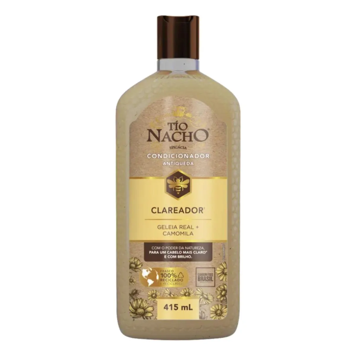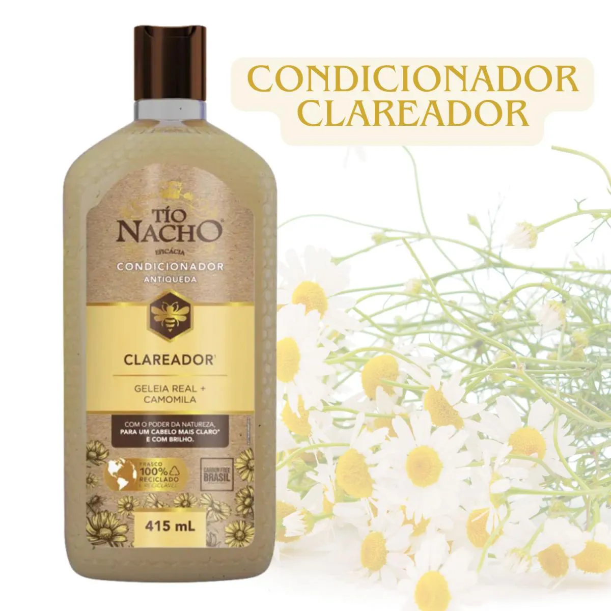 O Condicionador Tio Nacho Clareador hidrata e fortalece os fios, enquanto potencializa o efeito iluminado do shampoo Clareador. Sua fórmula com camomila, geleia real e extratos naturais nutre profundamente, deixando o cabelo macio, sedoso e com brilho radiante. Ideal para realçar e manter a luminosidade dos cabelos claros ou com mechas.
