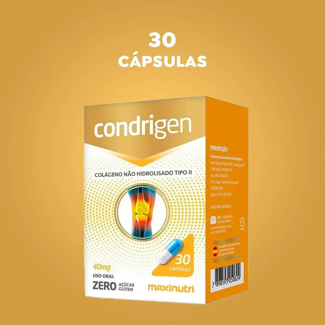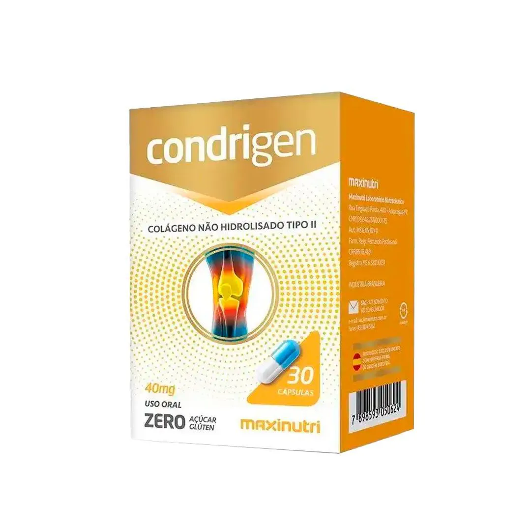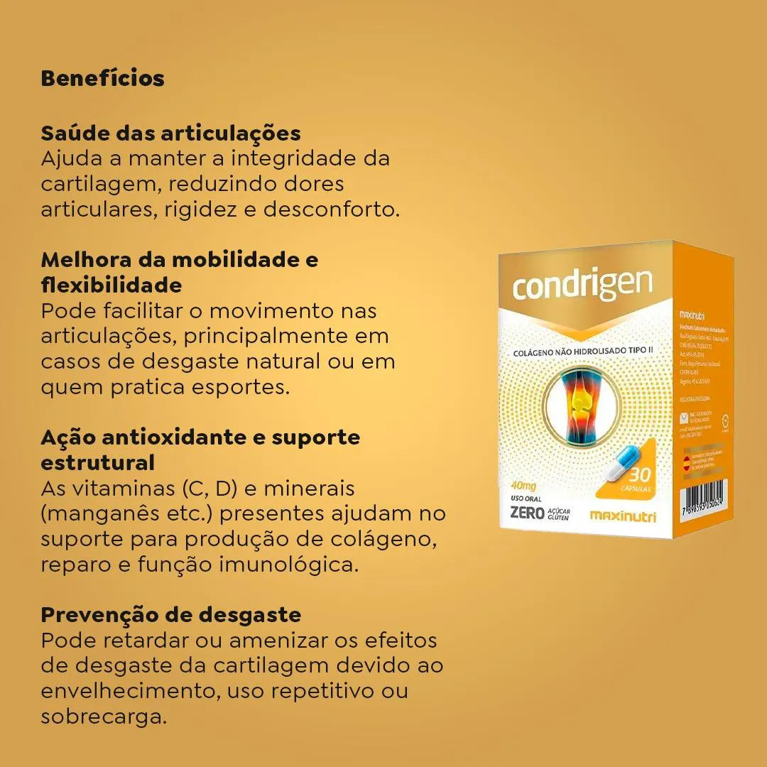 O Condrigen Maxinutri é um suplemento alimentar formulado com colágeno tipo II não hidrolisado (UC-II®), proteína estrutural que compõe a cartilagem articular e contribui para a sua integridade. Diferente do colágeno hidrolisado, esse tipo de colágeno é administrado em doses menores devido à sua forma nativa.